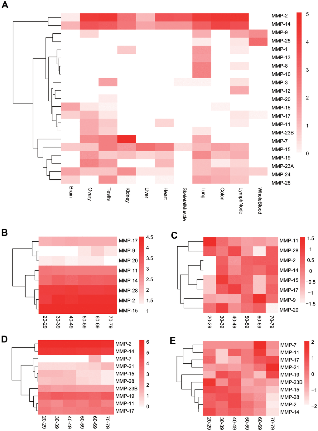 MMPs play important roles in human aging [29]. As effects of aging are particularly evident on both male and female reproductive system [30, 31], we further investigated longitudinal expression of the MMP genes in male and female reproductive organs, testis and ovary, respectively, by using GTEx data [32]. In testis, the male sexual organ, MMP-2, MMP-11, MMP-14, MMP-15, MMP-17 and MMP-28 are highly or moderately expressed across all ages from 20-79 (Figure 8B). MMP-11 showed gradually decreased expression during human aging, and all the other moderately or highly expressed genes showed lower expression at the ages of 20-29 than the older ages in testis (Figure 8C). In ovary, the female sexual organ, MMP-2, MMP-11, MMP-14, MMP-17 and MMP-28 showed universally moderate or high expression across all ages, the same as those in testis; in addition, MMP-19 and MMP-23B were highly expressed, too, which is different to those in testis (Figure 8C). Two lowly-expressed genes, MMP-7 and MMP-21, showed elevated expression during aging, and MMP-2, MMP-14, MMP-15 and MMP-28 showed the reversed trend in ovary (Figure 8D).