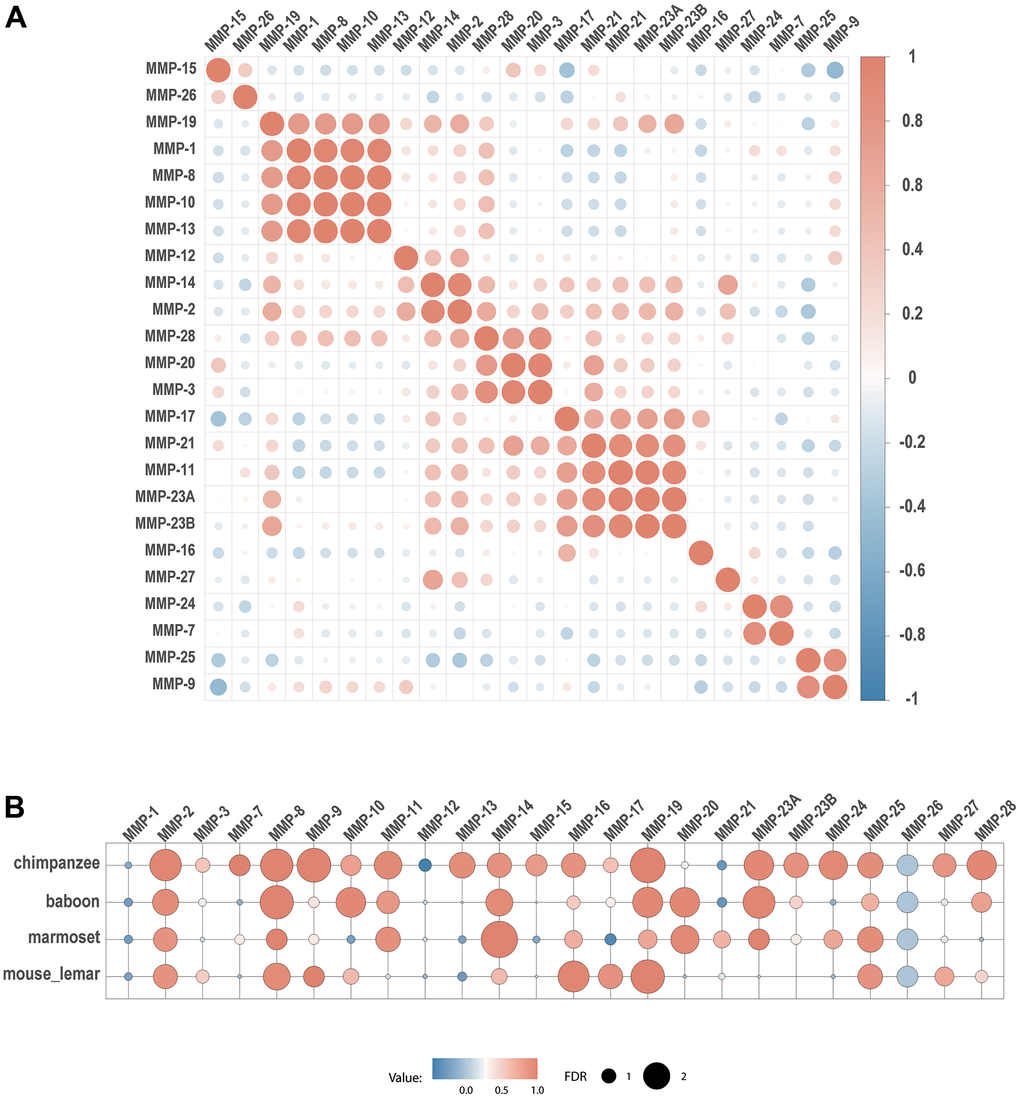 Expression of MMP-2 and MMP-8 showed the most conserved, as they showed co-expression between human and all the four non-human primate species (Figure 9B).