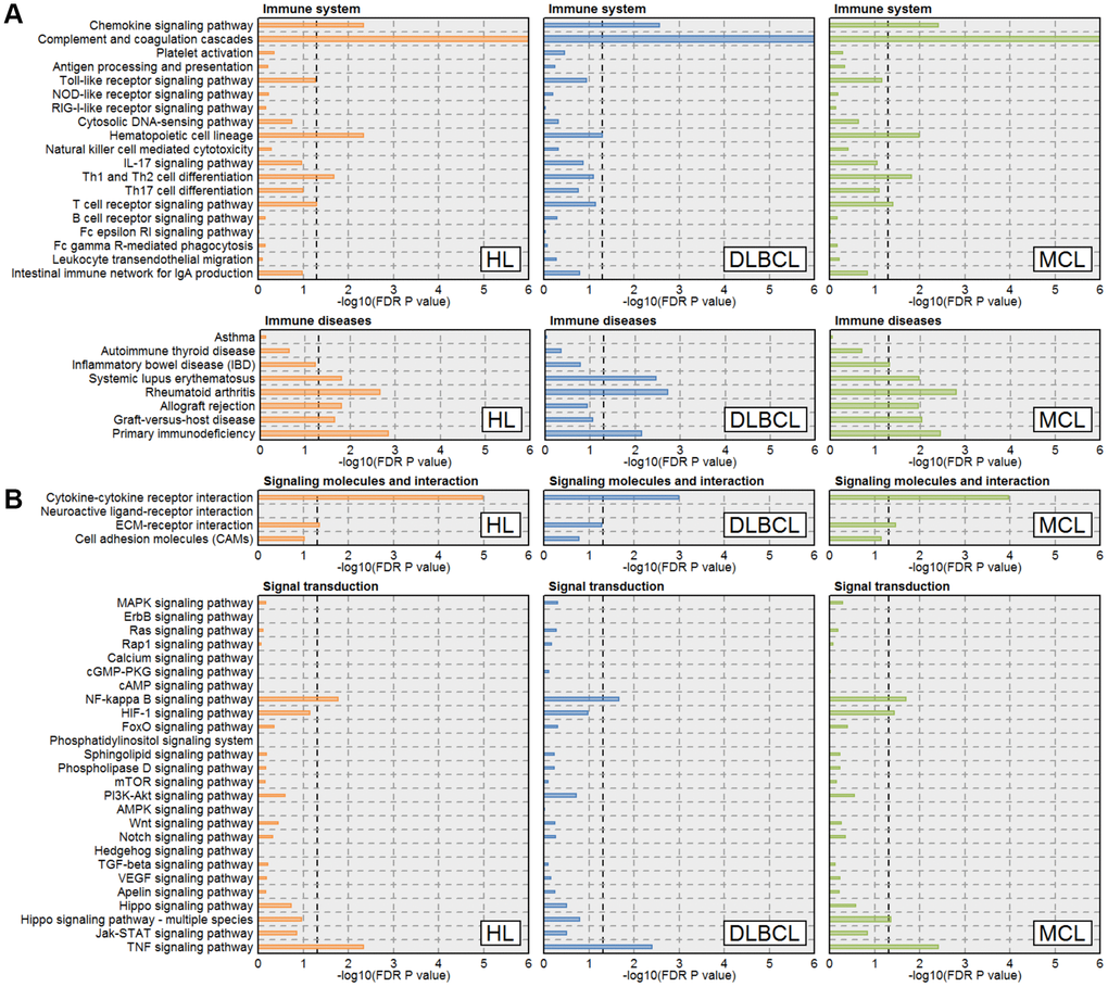 Lymphomas are solid tumors of the immune system. Physiological immune checkpoint pathways are important to regulate self-tolerance, limit immune reactions, and moderate autoimmunity. Several immune checkpoint inhibitors and other cellular immunotherapies have already shown great success in HL patients [4, 20]. The most well-established risk factor for the development of NHL is immunosuppression. Patients with HIV have an increased risk of developing high-grade NHL [8]. Recently, adoptive T-cell therapy with chimeric antigen receptor T cells (CAR-Ts) has achieved clinically successful application in patients with B-cell malignancies, new data from clinical trials have demonstrated the benefits of CAR-T therapy in the NHL setting [21]. In this study, we revealed multiple damaged immune-related pathways and deregulated immune genes shared by HL, DLBCL, and MCL. Most of these pathways and genes are related to cytokine functions.