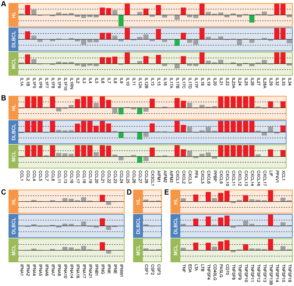 Cytokines, a broad and loose category of small proteins, play an important role in innate immune response and adaptive immune response. Cytokines can serve as metabolic hormones to provide adaptations to nutrient fluctuations, affect key metabolic processes such as glucose metabolism and lipid metabolism, eventually leading to multiple inflammations, metaflammation, and immunometabolic disorders [15]. A previous report demonstrated that Epstein-Barr virus (EBV)+ and EBV- cHL tissues can be separated from each other by a series of gene markers, such as CXCL9, CXCL10, CCL20, and other genes that involve innate immunity and antiviral responses in EBV+ tumors [16]. Other studies have also reported that cytokines (including CCL3, CCL4, and CCL18) may affect the lymphoma microenvironment and patient survival both in DLBCL and MCL [17, 18]. However, there is a lack of systematic studies on these cytokines in different lymphomas. Therefore, this study aims to explore the expression and function of multiple cytokines, as well as explore key cytokines and their regulations in HL, DLBCL, and MCL through transcriptome integration analysis.