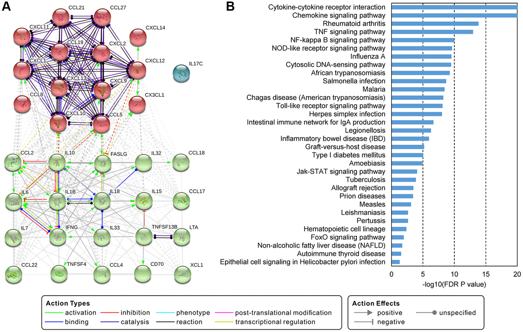 We used the collected cytokines to match the lymphoma database and got 44 interleukins, 43 chemokines, 17 interferons, 3 colony stimulating factors, and 18 tumor necrosis factors. Expression profiles of these cytokines in HL, DLBCL, and MCL showed in Figure 2. There were 34 up-regulated cytokines in all three lymphomas. In addition, we found IL8, IL9, IL12B, IL17B, IL26, CCL20, CCL24, LIF and TNFSF10 expressed varies in three types of lymphoma. The protein-protein interaction network of the 35 commonly deregulated cytokines showed in Figure 3. By k-means clustering, we divided these cytokines into three categories. We found there were strong interactions between multiple C-C motif chemokine ligands and C-X-C motif chemokine ligands. Only IL17C has no interaction with other cytokines. There were 32 significantly enriched KEGG pathways of these commonly deregulated cytokines. Most of these pathways are associated with immune function and signaling pathways, such as cytokine-cytokine receptor interaction, chemokine signaling pathway, TNF signaling pathway, NF-κB signaling pathway, NOD-like receptor signaling pathway, and Jak-STAT signaling pathway.