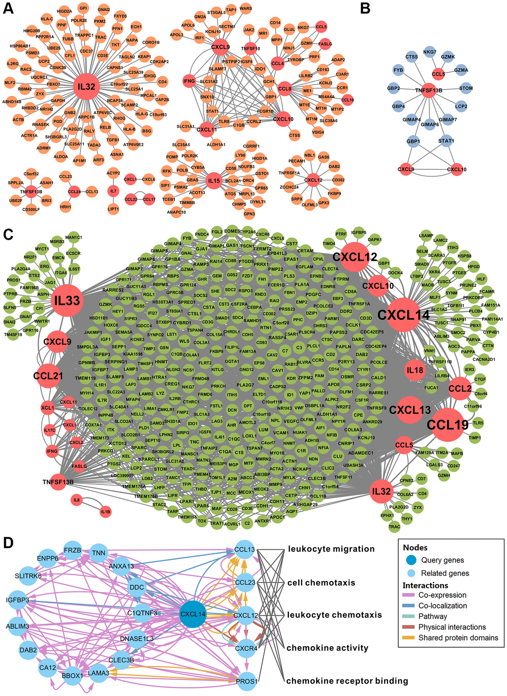 Co-expression networks of deregulated cytokines and related genes in HL, DLBCL, and MCL showed in Figure 4. According to our screening criteria, there were 19 cytokines and 174 co-expressed genes in the HL network (Figure 4A), 4 cytokines and 14 co-expressed genes in the DLBCL network (Figure 4B), and 22 cytokines and 422 co-expressed genes in the MCL network (Figure 4C). The number of nodes in the DLBCL network is too small and lacks statistical power. The MCL network had the highest clustering coefficient and network centralization (Supplementary Table 5). There were no more than 100 nodes of cytokines in the HL or DLBCL network. However, there were 11 cytokines with nodes more than 100 in the MCL network (CXCL14, CCL19, IL33, CXCL12, CXCL13, CCL21, IL32, CCL2, CXCL9, CXCL10, and IL18, Supplementary Table 6). Therefore, we identified these genes as key cytokines in MCL. Among these genes, CXCL14 has the largest number of nodes and its function on lymphoma has not been reported yet. The functional interaction network showed there was physical interaction between CXCL14 and CXCR4 (Figure 4D). GO biological process enrichment analysis of these CXCL14 related genes suggested that CCL13, CCL23, CXCL12, CXCR4, and PROS1 were involved in the following 5 biological processes: leukocyte migration, cell chemotaxis, leukocyte chemotaxis, chemokine activity, and chemokine receptor binding.