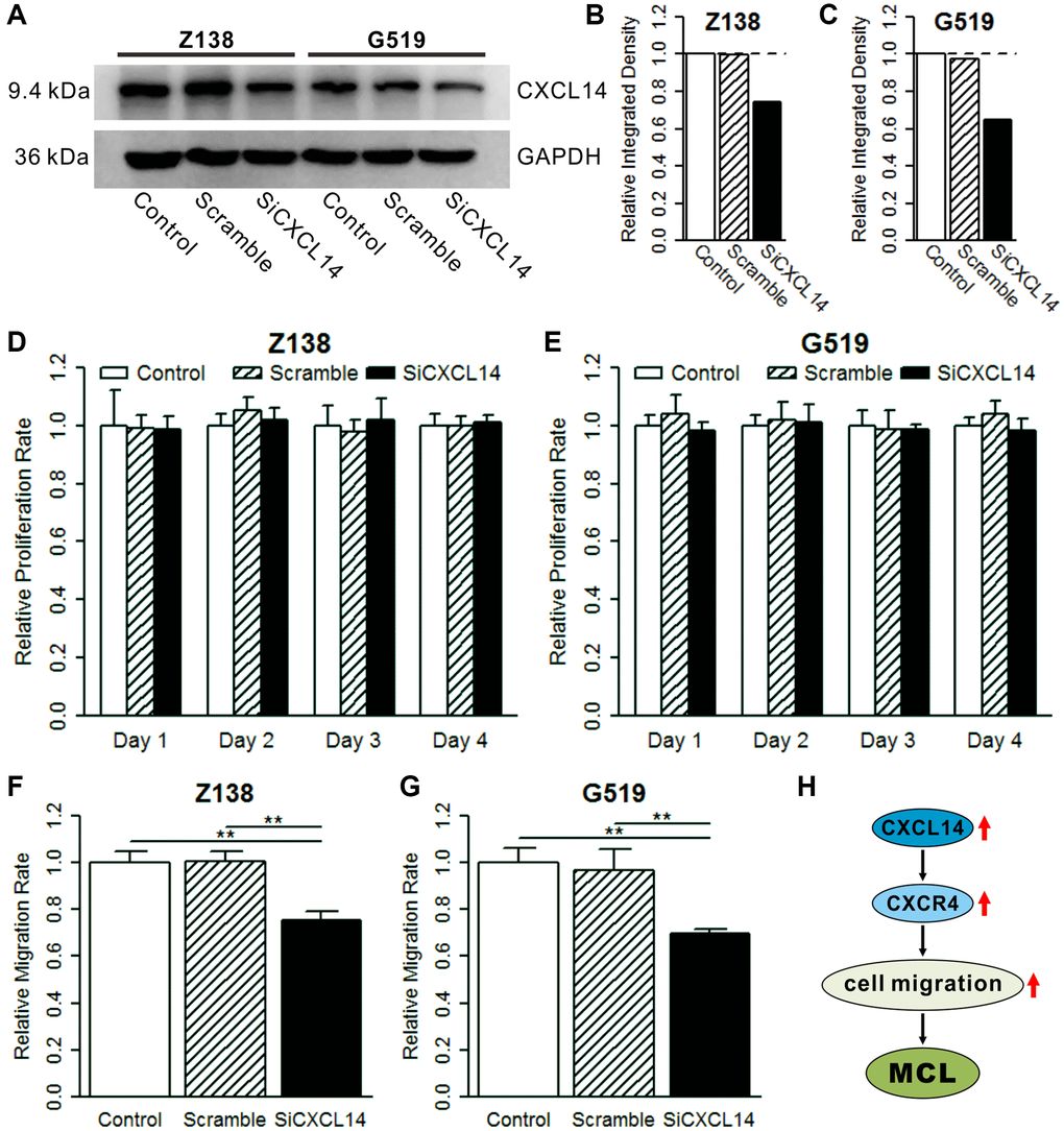 We examined the mRNA and protein expression of CXCL14 in a normal B cell line (GM12878) and MCL cell lines (Z138 and G519). CXCL14 mRNA and protein level in Z138 were higher than in GM12878 whereas in G519 showed a lower expression (Supplementary Figure 1). To explore the function of CXCL14 on MCL, we constructed CXCL14 knockdown MCL cell lines (Z138 and G519) and performed a cell proliferation and migration assay. The results showed a lower CXCL14 protein level in the siCXCL14 group compared with control and scramble groups in Z138 and G519 cell lines (Figure 5A–5C). There was no influence of CXCL14 knockdown on cell proliferation (Figure 5D, 5E). Interestingly, the siCXCL14 group showed a significantly decreased relative migration rate compared with control and scramble groups in both two MCL cell lines (Figure 5F, 5G). The above analysis showed that high expressed CXCL14 affected cell chemotaxis and migration functions in MCL (Figure 5H). Combined with the experimental results, we speculated that high expressed CXCL14 may promote cell migration and aggravate MCL.