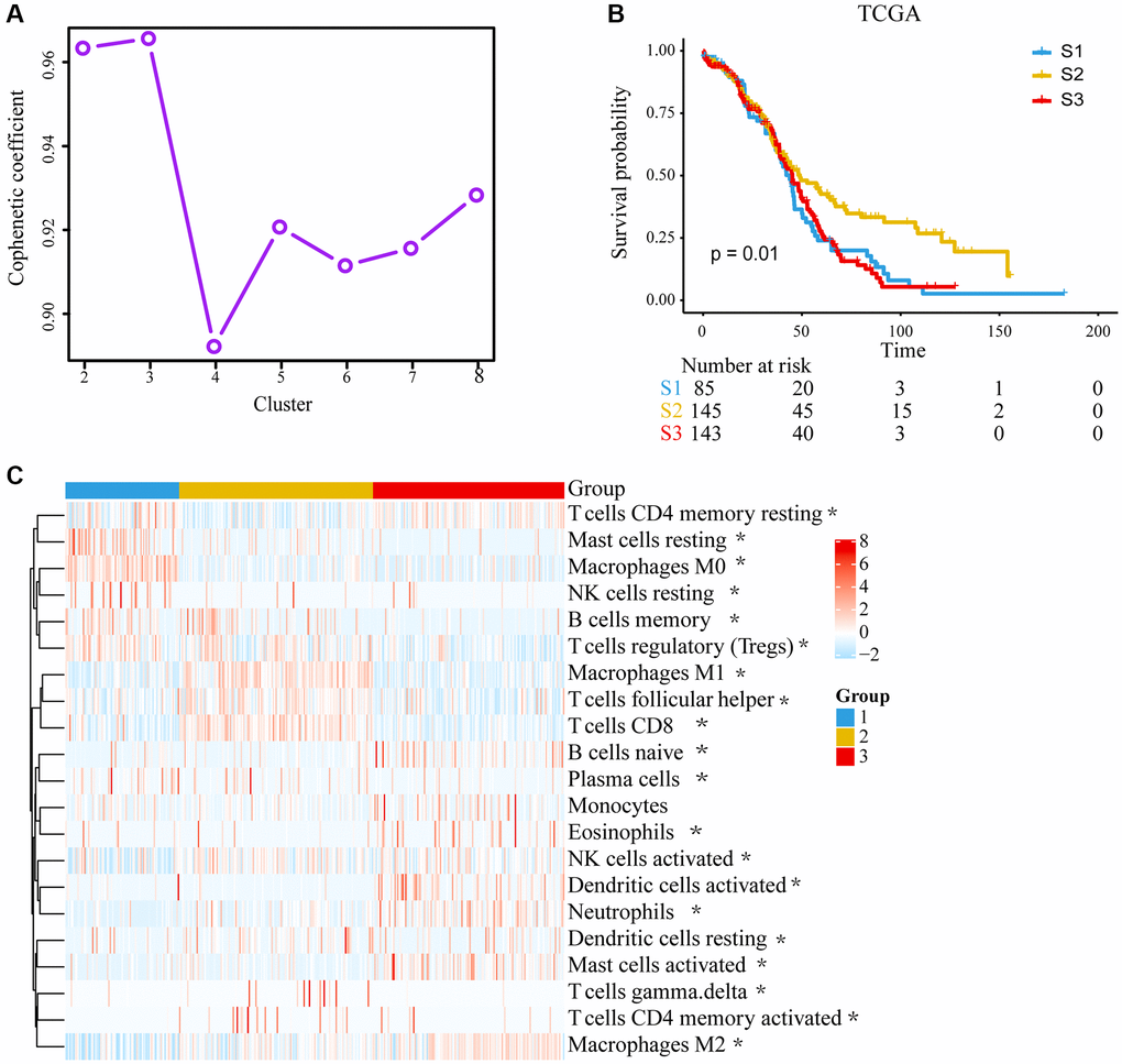 The workflow for this study is shown in Supplementary Figure 1. The landscape with LM22 in TCGA was analyzed by CIBERSORT computational algorithms (Supplementary Table 1). With the NMF method, cluster numbers k = 3 was chosen as a final cluster number because of the suitability of clustering (Figure 1A) [15]. Finally, 373 samples with TME cell expression profiles were divided into three subgroups, named TME cluster-1, TME cluster-2 and TME cluster-3. We found that TME cluster-2 had a significantly longer OS than others (P = 0.0102; Figure 1B). TME cluster-2 exhibited high infiltration of CD8 T cells, activated memory CD4 T cells, follicular helper T cells, M1 macrophages, gamma delta T cells and so forth. While TME cluster-1 and TME cluster-3 were characterized by increases in the infiltration of resting mast cells, resting NK cells and M0 macrophages or M2 macrophages, activated dendritic cells, neutrophils and activated mast cells, respectively (Figure 1C).