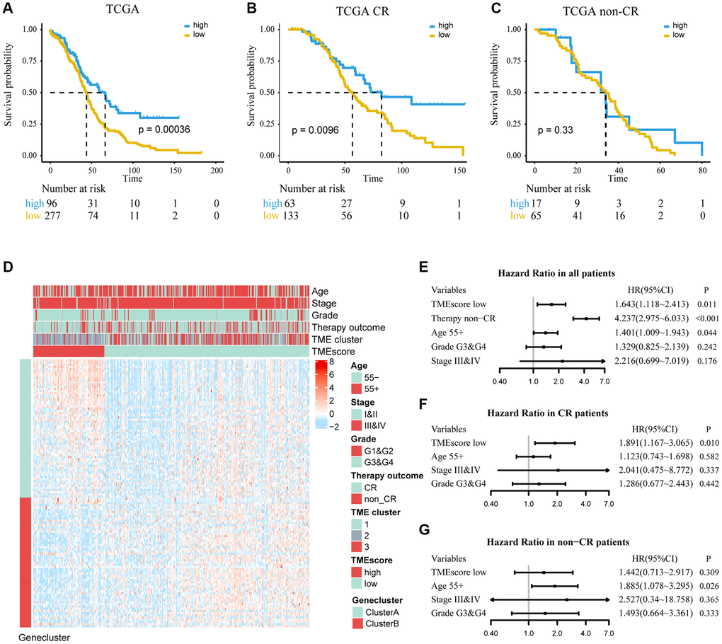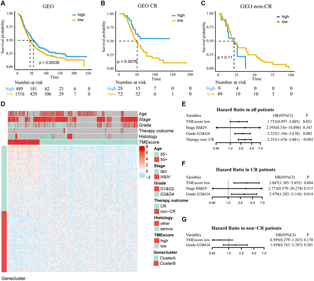 We used independent datasets from the GEO database to further validate TMEscore. A total of 2,005 ovarian cancer patients were divided into high and low TMEscore groups by the same cutoff value. It was found that low TMEscore group had a worse prognosis (HR, 1.275; 95% CI, 1.116–1.457; P < 0.001; Figure 4A). A multivariate Cox regression model was constructed, and its C-index was 0.677 ± 0.030, in which TMEscore (HR, 1.731; 95% CI, 0.997–3.005; P = 0.051) was might an independent prognostic factor (Figure 4E). Expression profile of DEGs was similar to TCGA and shown in Figure 4D. Further, in subgroup analysis, we found that TMEscore had a better performance to predict the prognosis for patients who showed CR than non-CR to chemotherapy (Figure 4B, 4C and 4F, 4G). Consistent with TCGA, we redefined the chemotherapy outcome (CR and PR as responder; non-CR and non-PR as non-responder) and found TMEscore could be used as an independent predictive factor in responders (Supplementary Figure 3).