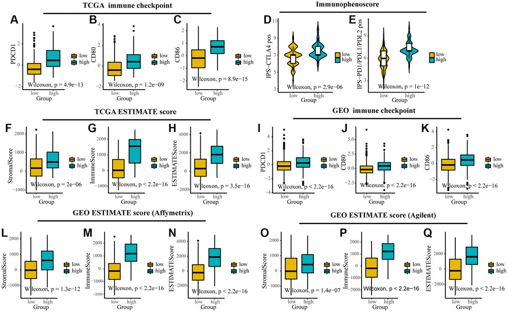 In addition, we found that TMEscore could predict the response of ICIs and could provide a basis for subsequent immunotherapy. By comparing the expression of immune checkpoints (CD80, CD86, and PDCD1) and stromal and immune scores computed by ESTIMATE between different groups, we found that they were highly expressed in high TMEscore group in TCGA and GEO (Figure 5A–5C, 5F–5H, 5I–5K, 5L–5Q). IPS was introduced to evaluate the patients’ responses to ICI treatment because of the information on ICI treatment was not available in TCGA and GEO datasets. The IPS values (IPS-CTLA-4_pos and IPS-PD-1/PD-L1/PD-L2_pos) as the alternative of the ovarian cancer patients’ responses to anti-CTLA-4 and anti-PD-1/PD-L1 treatment were increased in the high TMEscore group (Figure 5D, 5E). It’s likely that the patients in the high TMEscore group have a better immune microenvironment and respond better to ICIs.