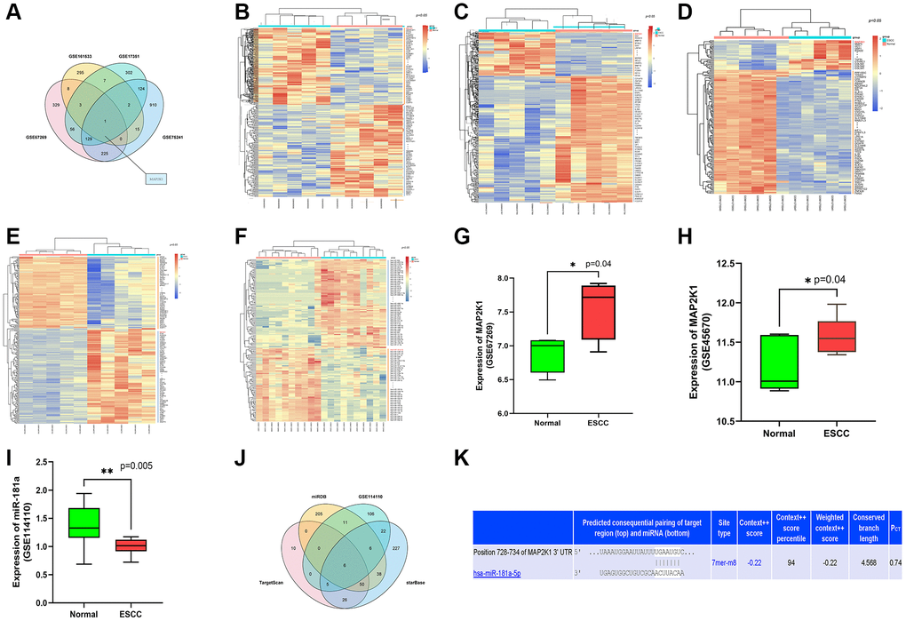 We analyzed gene expression profiles from Gene Expression Omnibus (GEO) database, GSE161533, GSE17351, GSE75241 and GSE67269, which were comprised of ESCC samples. DEGs were identified in these datasets with P < 0.05 and |logFC|>2. Following that, the top 300 DEGs in both datasets were determined. Among these DGEs, only one overlapped gene, MAP2K1 (MEK1), was discovered (Figure 1A). Heatmaps of the top 100 DEGs in GSE16153 (Figure 1B) GSE17351 (Figure 1C) and GSE67269 (Figure 1D). and GSE75241 (Figure 1E). Heatmap was depicted with the differentially expressed miRNA (DEMs) of GSE114110 (Figure 1F). MAP2K1 was identified as highly expressed gene in ESCC from the data in GSE67269 (Figure 1G) and GSE45670 (Figure 1H). The high expression of MAP2K1 in these datasets suggested that MAP2K1 might affect the development of ESCC. miR-181a was identified as low expressed microRNA in ESCC from the data in GSE114110 datasets (Figure 1I). The low expression of miR-181a in these datasets suggested that miR-181a might affect the development of ESCC. Assumed miRNAs targeting MAP2K1 (MEK1) gene were predicted using TargetScan, miRDB, and starBase. Six common predictive miRNAs were identified by analyzing the top 100 miRNAs from each prediction website: hsa-miR-30a-3p, hsa-miR-30b-5p, hsa-miR-145, hsa-miR-21-3p, hsa-miR-181a-5p, and hsa-miR-455-5p (Figure 1J). By comparing prediction findings, the predicted binding sites of mir-181a-5p and map2k1 were queried using targetscan online database was used to discovery that miR-181a-5p had targeted binding sites with MAP2K1 (MEK1) (Figure 1K). Emerging evidence indicates that miR-30a-3p, miR-30b-5p, miR-145, miR-21-3p and miR-455-5p are differentially expressed in ESCC, but the role of miR-181a-5p in ESCC has so far not been investigated.