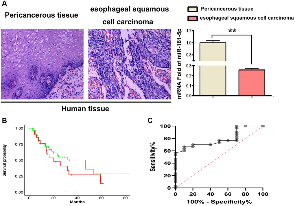 We used immunohistochemical labeling and RT-qPCR to examine the expression of miR-181a-5p in human ESCC tissues and their equivalent surrounding peri-cancerous tissues to determine the influence of ESCC on miR-181a-5p. As shown in Figure 2A, it was found that miR-181a-5p staining was positive in peri-cancerous sections, whereas small amount stained positive for miR-181a-5p in ESCC tumor sections. The relative expression level of miR-181a-5p was notably lower in the ESCC tumor specimens than in the adjacent peri-cancerous specimens (Figure 2A, P < 0.05). Kaplan-Meier’s method was used for survival analysis and miR-181 survival curve and shown in Figure 2B. The diagnostic value of miR-181a-5p in ESCC was also estimated using the receiver operating characteristic (ROC) curve. From the data in GSE114110, Kaplan-Meier analysis revealed that miR-181a-5p was related with greater overall survival (Figure 2C), suggesting that miR-181a-5p may play an important role in ESCC development.