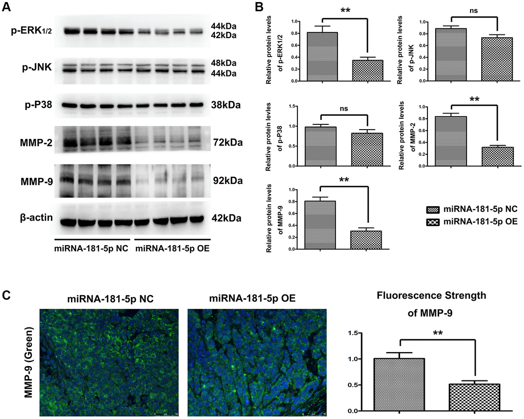 Elevation of miR-181a-5p downregulated ERK1/2 to block the MMP2/9 signaling pathway in vivo