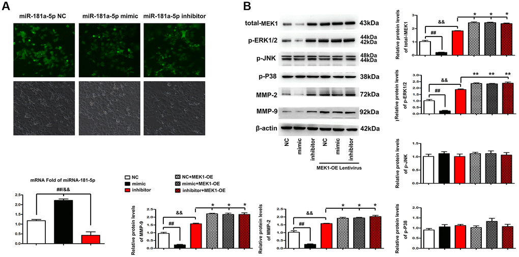 The signal cascade of JK-125 is the key to promote cell proliferation and metastasis, including the signal cascade of jk-125, which can promote the proliferation of tumor cells, MEK1 can also be used as a key signal node to regulate the expression of ERK1/2 and transmit signals to the nucleus [29]. The phosphorylation of MEK1 can activate ERK1/2 and promote the expression of transcription factors, jointly regulating a variety of cellular and biological functions in the development of cancer [30]. In our study, mir-181a-5p mimic can effectively reduce MEK1 and ERK1/2, while transfection of MEK1 overexpression lentivirus can reverse this effect. However, the expression of p-JNK and p-p38 are not affected by these treatments, indicating that mir-181a-5p plays a role through ERK signal pathway in esophageal cancer, rather than JNK signal pathway and p38MAPK signal pathway. As the main family members of MMPs, MMP2 and MMP9 play an important role in the invasion and metastasis of cancer cells. MMP2 can degrade the basement membrane, and MMP9 can induce tumor cells to infiltrate and migrate to surrounding tissues along the damaged basement membrane [31]. In this study, mir-181a-5p mimic can significantly reduce the expression, scratch and migration of MMP2/9 Invasion experiments confirmed that mir-181a-5p mimic could inhibit the motility of esophageal cancer cells, and the cells were transfected with MEK1 overexpression lentivirus at the same time, which was reversed, which further proved the inhibitory effect of mir-181a-5p on the motility of esophageal cancer.