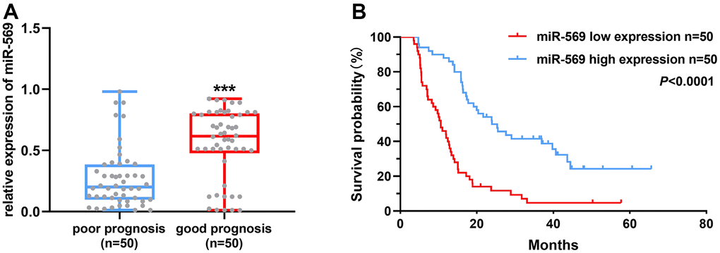Patients with pancreatic cancer were divided into the following two groups: poor prognosis, 12 months or less; and good prognosis, above 21 months according to the survival time. As shown in Figure 1A, the high miRNA-569 expression has a good prognosis, suggesting that miR-569 could serve as a good prognostic marker. Furthermore, the overall survival of PC patients with low miRNA-569 expression is shorter (Figure 1B). The median survival time of the low expression group was 10.6 months, while the high-expression group was 24.0 months.