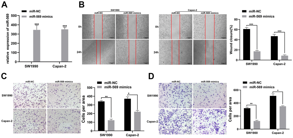 PC is prone to metastasis in the late stage, especially liver metastasis, leading to a poor prognosis. The expression levels of miR-569 after transfection of mimics in SW1990 and Capan-2 cells were confirmed. As expected, miR-569 levels were significantly up-regulated after transfection of mimics (Figure 2A). Scratch assay and Transwell experiment indicated that, compared to miR-NC, the exogenous increase of miRNA-569 expression can inhibit the migration of PC cells (Figure 2B, 2C). Furthermore, the Transwell invasion assay also helped to confirm that overexpression of miRNA-569 could inhibit cell invasion (Figure 2D), thus, these data revealed that miRNA-569 has an obvious anti-metastatic effect.