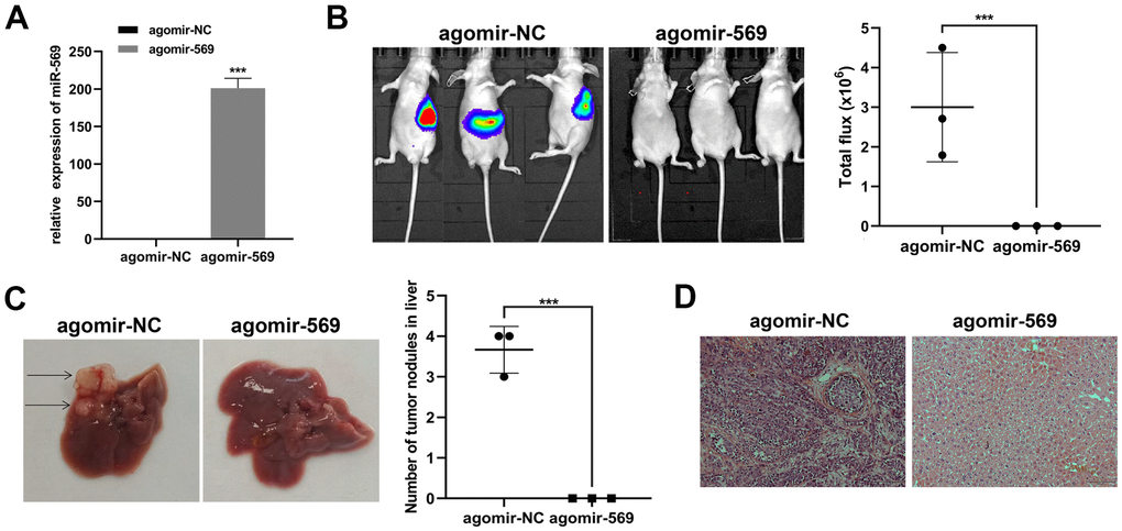 Then, we focus on the antitumor effect of miRNA-569 in vivo. Capan-2 was transfected with agomir-569 and control, respectively. Transfected cells were injected into the spleen of mice to establish the liver metastasis model, and the metastatic focus was evaluated ten weeks later (Figure 3A). Ex vivo luciferase imaging demonstrated that miRNA-569 overexpression significantly reduced liver metastasis in Capan-2 cells compared with negative control (Figure 3B). The number of metastatic foci in mice injected with agomir-569 cells decreased significantly (Figure 3C). As indicated in Figure 3D, the hepatic metastatic foci were stained by hematoxylin and eosin (HE). In summary, it can be inferred that miRNA-569 can inhibit liver metastasis of PC, which might have certain clinical significance.