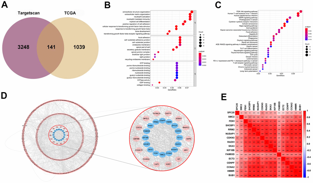 The public database TargetScan (http://www.targetscan.org/vert_72/) was used to determine the potential miR-mRNA interactions. The predicted target genes are intersected with aberrantly expressed data from the TCGA portal (http://tumorsurvival.org/) database displayed by a Venn diagram. GO annotation and KEGG pathway of target genes were performed by DAVID 6.8 software (https://david.ncifcrf.gov/). The results were visualized with the “clusterProfiler _3.11.0” package of the R 3.6.0 language. PPI networks were generated by STRING 11.0 (http://string-db.org), which aimed to assess and integrate proteins from prediction or experiments. The interaction network was visualized by Cytoscape 3.8.1 and the MCODE plugin was conducted to screen potential clusters. In the process of selecting model parameters, the minimum absolute contraction and LASSO regression methods are widely used. The “glmnet 4.1.2” package was selected for modeling research. The Oncomine database (http://www.oncomine.org) was applied to analyze the transcription expression level of the NUSAP1.