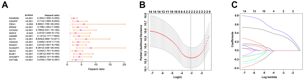 TargetScan was used for the prediction of the target genes. Then by interaction with up-regulated genes as evidenced by the TCGA database, 141 target genes were identified and viewed in the form of a Venn diagram (Figure 4A). GO and KEGG analyses were applied to clarify the function of miRNA-569. GO analysis is composed of Biological processes (BPs), cellular components (CCs), and molecular functions (MFs) [18], which mainly concentrated on the extracellular matrix organization, focal adhesion, and GTPase activity, which were critical in the processes of cell biology (Figure 4B). For KEGG analysis, the PI3K-Akt signaling pathway and MAPK signaling pathway were reported to be closely related to the cancerous process of PC (Figure 4C). To screen hub genes, we constructed a protein-protein interaction network that consists of 399 nodes and 1499 edges, and we then focused on the 16 hub genes in the network highlighted by cytoHubba according to their degree of overexpression (Figure 4D, 4E). Since miRNA-569 was closely associated with prognosis, the LASSO Cox analysis was used to limit the possible choices of hub genes to facilitate the selection of only the most useful target genes. This allowed us to identify two genes (ECT2 and NUSAP1) (Figure 5A–5C). The biological function of ECT2 in pancreatic cancer had been discussed in our previous work [19], so we mainly focused on NUSAP1 during subsequent research.