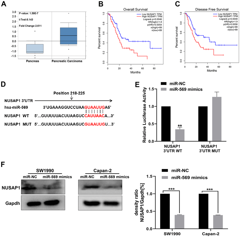 By analyzing data available within the Oncomine database, NUSAP1 was found to be up-regulated in PC tissues relative to normal control (Figure 6A). High expression of NUSAP1 significantly shortened the overall survival time and disease-free survival time (Figure 6B). The base pairing was observed between mature miR-569 and the 3’-UTR region of the NUSAP1 gene-seed sequence (Figure 6C). A dual-luciferase experiment was then performed: as shown in Figure 6D, for the NUSAP1-3’-UTR-WT group, compared with miR-NC, the luciferase activity of miR-569 mimics was weakened. However, there was no significant difference in the NUSAP1-3’-UTR-MT group. In addition, miR-569 could block the expression of NUSAP1 protein (Figure 6E).