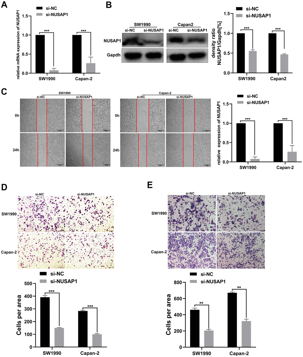 Then, we explored the influence of changes in the expression of NUSAP1 on the malignant biological behavior of PC. PCR and Western blot assay were carried out to validate the knockdown efficiency (Figure 7A, 7B). As expected, NUSAP1 knockdown significantly inhibited PC cell migration (Figure 7C). In addition, Transwell experiment demonstrated that knockdown of endogenous NUSAP1 expression inhibited migration and invasion of SW1990 and Capan-2 (Figure 7D, 7E).