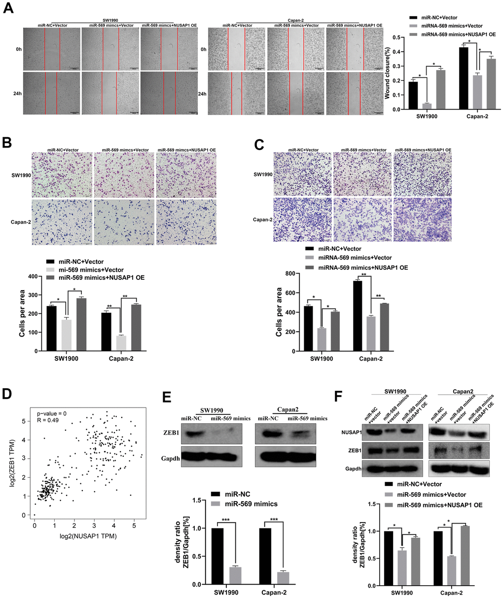 A functional rescue experiment was performed to further determine whether miRNA-569 inhibits the metastasis of PC cells by targeting NUSAP1. As shown in Figure 8A, 8B, NUSAP1 over-expression reversed the suppression of miRNA-569 up-regulation on PC cell migration. Meanwhile, the reintroduction of NUSAP1 reversed the repression of miRNA-569 on PC cell invasion (Figure 8C). Those results showed that NUSAP1 was involved in mediating the inhibitory effect of miRNA-569 on tumor metastasis. Zinc finger E-box binding homeobox 1 (ZEB1), was also related to tumor metastasis by promoting cell migration and invasion [20]. The GEPIA database showed a significantly positive correlation between NUSAP1 and ZEB1 in PC tissues (Figure 8D). We speculated that miRNA-569/NUSAP1 probably changes the aggressiveness of PC cells by co-regulating ZEB1. As expected, Western blot assay showed that miRNA-569 up-regulation decreased ZEB1 protein levels, whereas over-expressing NUSAP1 restored ZEB1 expression (Figure 8E, 8F). Collectively, these data suggested that NUSAP1 can promote metastasis via ZEB1 up-regulation, while the NUSAP1/ZEB1 axis can be inhibited by miRNA-569.