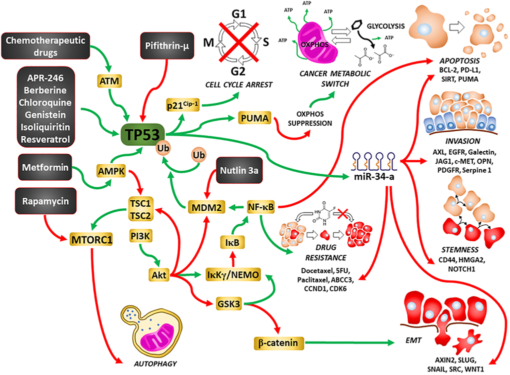 Table 1. Chemotherapeutic drugs, signal transduction inhibitors, natural products used in this study and their targets, mode of action, and intersections with the TP53 pathway.1,2