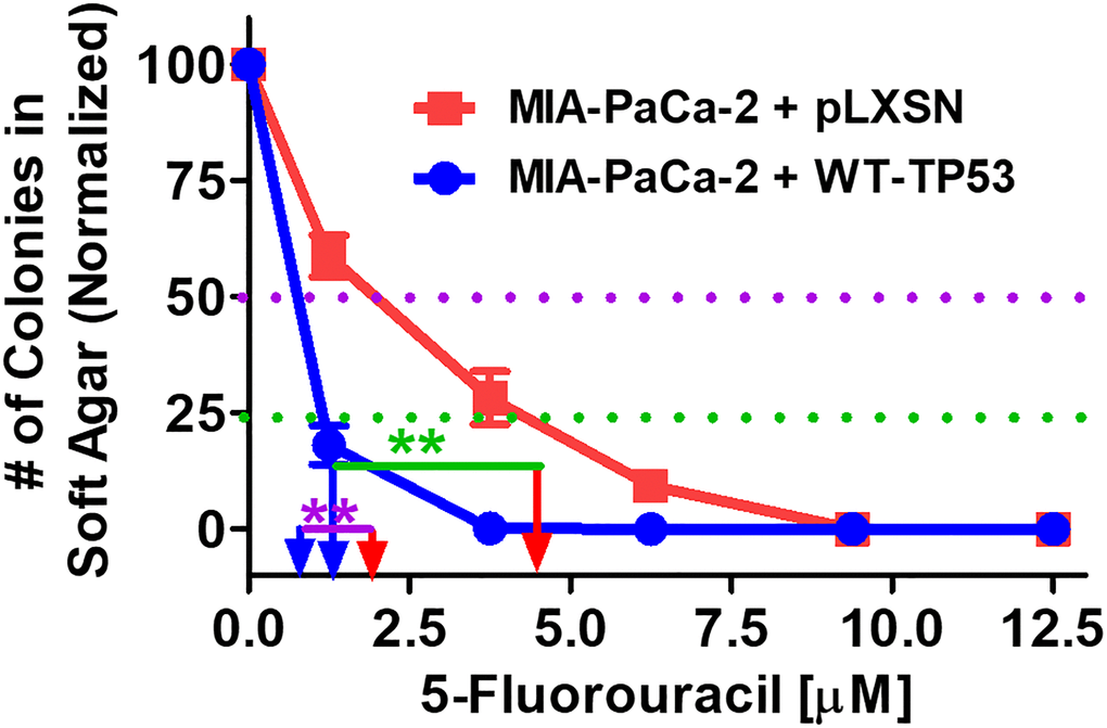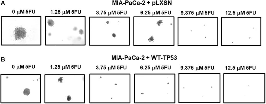 The effects of restoration of WT-TP53 activity on the ability to form colonies in increasing concentrations of 5FU were compared. As documented in Figure 9, restoration of WT-TP53 activity in MIA-PaCa-2 cells inhibited their ability to form colonies in soft agar in the presence of 5FU.