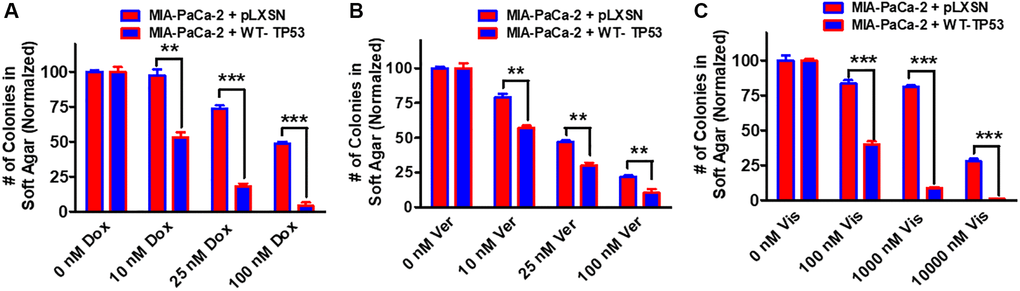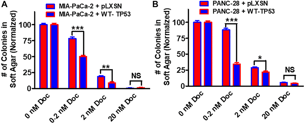 Restoration of WT-TP53 activity in both MIA-PaCa-2 and PANC-28 cells decreased their ability to form colonies in soft agar containing docetaxel (Figure 11). Introduction of WT-TP53 activity decreased the ability of MIA-PaCa-2 cells to form colonies in soft agar containing doxorubicin (Figure 12A).