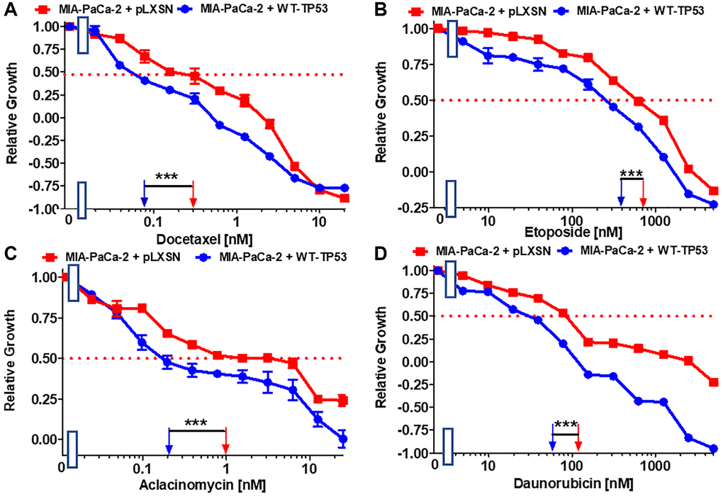 Docetaxel is a common chemotherapeutic drug used to treat various cancer types including PDAC. The IC50 for docetaxel in MIA-PaCa-2 + WT-TP53 cells was 3.8-fold lower than in MIA-PaCa-2 + pLXSN cells (Figure 2A). The effects of WT-TP53 on the sensitivity to three topoisomerase inhibitors used in cancer therapy were also examined (Figure 2B–2D). The IC50s for all the inhibitors were lower (~ 2-fold for etoposide and daunorubicin, and 5-fold for aclacinomycin) in MIA-PaCa-2 + WT-TP53 cells than in MIA-PaCa-2 + pLXSN cells.