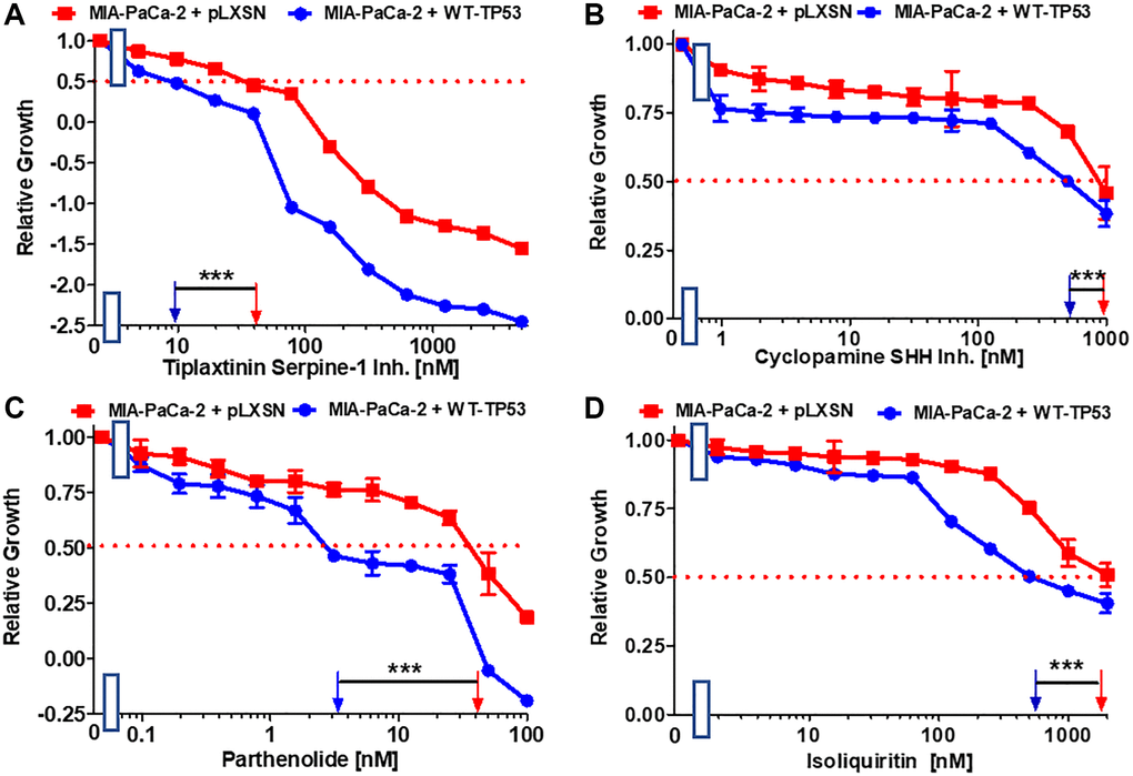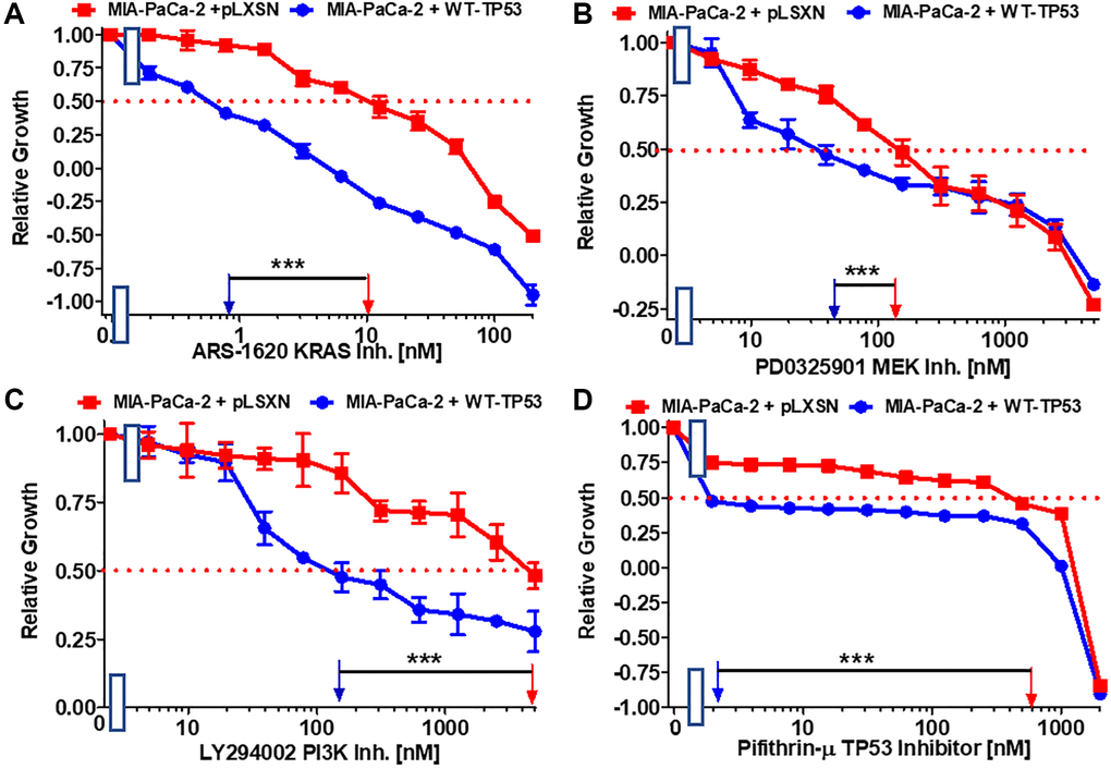 Pifithrin-μ is a small molecule that inhibits the interactions of TP53 with either BCL2 or BCLXL at the mitochondrial membrane. This results in the induction of apoptosis. However, Pifithrin-μ does not inhibit the effects that TP53 has on transcription [48]. Restoration of WT-TP53 in MIA-PaCa-2 cells resulted in a pifithrin-μ IC50 240-fold lower than that detected in MIA-PaCa-2 cells which lack WT-TP53 activity (Figure 3D).