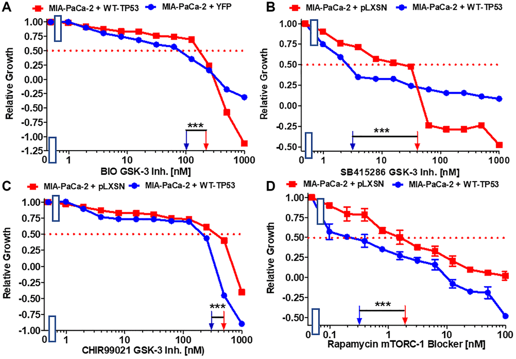 GSK-3 is a multifunctional kinase that is involved in the regulation of many processes both in normal physiological and malignant growth [49]. GSK-3 has been shown to be important for the interactions between KRas and NF-κB [50, 51]. GSK-3 is an important target in many cancers. GSK-3 inhibitors have been suggested for the treatment of PDAC [52]. The effects of GSK-3 inhibitors BIO, CHIR99021 and SB415286 on MIA-PaCa-2 cells containing and lacking WT activity were examined. Restoration of WT-TP53 activity in MIA-PaCa-2 cells resulted in over 13-fold lower IC50 for SB415286 and only about 2-fold lower IC50 for BIO and CHIR99021 than in cells lacking WT-TP53 activity (Figure 4A–4C).
