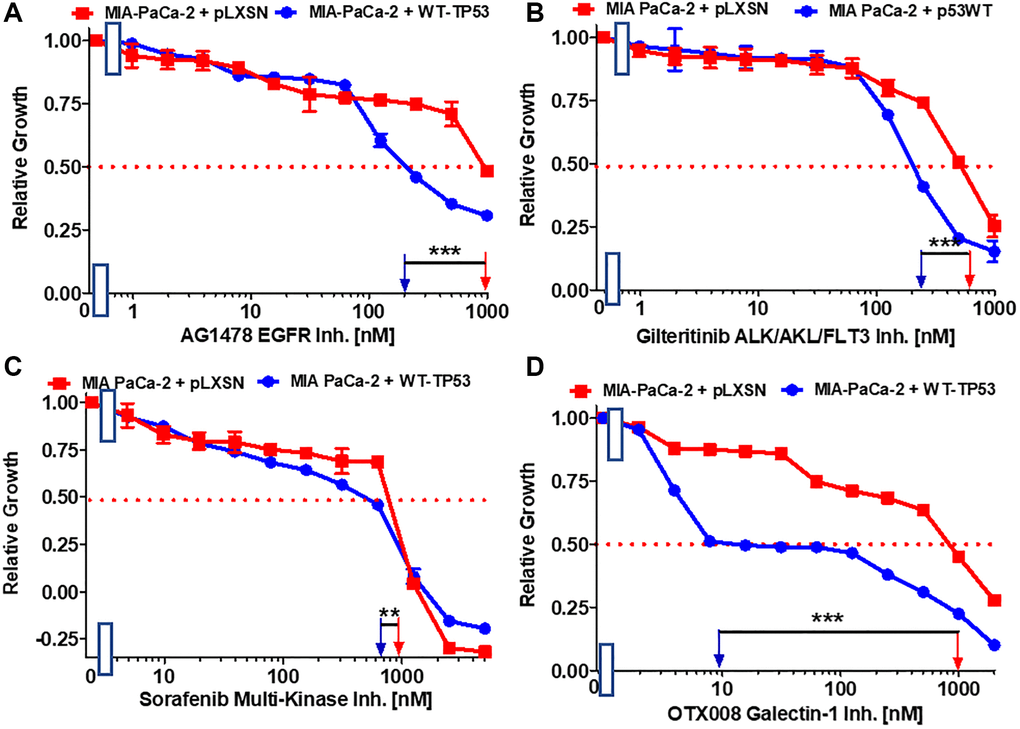 EGFR, HER2, ALK, AXL, FLT3, PDGFR and other receptors and signal transducers (e.g., Raf) are involved in the metastasis of various cancers [55–61]. The effects of: the AG1478 EGFR inhibitor, the multi-kinase ALK, AXL, FLT3 inhibitor gilteritinib and multi-kinase Raf, PDGFR, FLT3, VEGFR inhibitor sorafenib on the growth of MIA-PaCa-2 cells expressing WT-TP53 or not were ascertained. Introduction of WT-TP53 into MIA-PaCa-2 cells resulted in reduction of the IC50s for all the inhibitors in comparison to the IC50s in MIA-PaCa-2 cells lacking WT-TP53 expression (Figure 5A–5C) but the reduction was most pronounced for the AG1478 EGFR inhibitor.