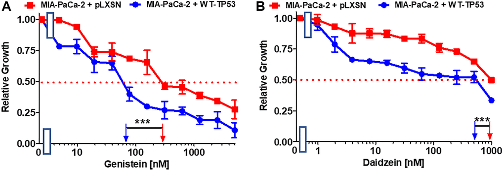 Daidzein is an additional isoflavone. It inhibited breast cancer growth in rodent models [75, 76]. Restoration of WT-TP53 activity in MIA-PaCa-2 cells increased the sensitivity to daidzein 1.7-fold (Figure 7B).