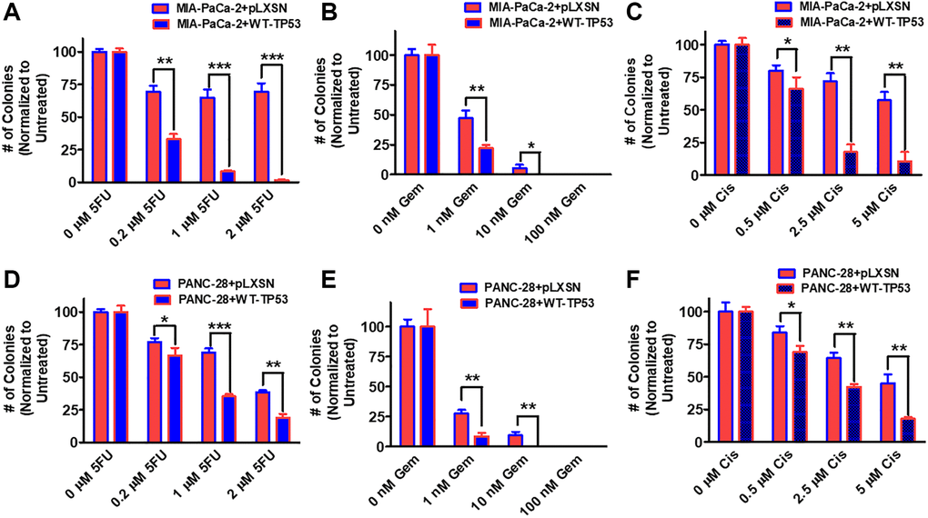 The ability of WT-TP53 to suppress clonogenicity in 5-fluorouracil, gemcitabine and cisplatin was determined in MIA-PaCa-2 and PANC-28 cell containing and lacking WT-TP53. Upon restoration of WT-TP53 activity in MIA-PaCa-2 and PANC-28 cells, clonogenicity decreased in a dose-dependent fashion more dramatically in cells containing WT-TP53 activity (Figure 8). Although gemcitabine inhibited clonogenicity in cells containing and lacking WT-TP53 activity. Thus, restoration of WT-TP53 suppressed clonogenicity in larger culture volumes containing chemotherapeutic drugs carried out for 14–21 days and it reduced the IC50s for chemotherapeutic drugs in smaller cultures carried out over 5 days [40, 41].