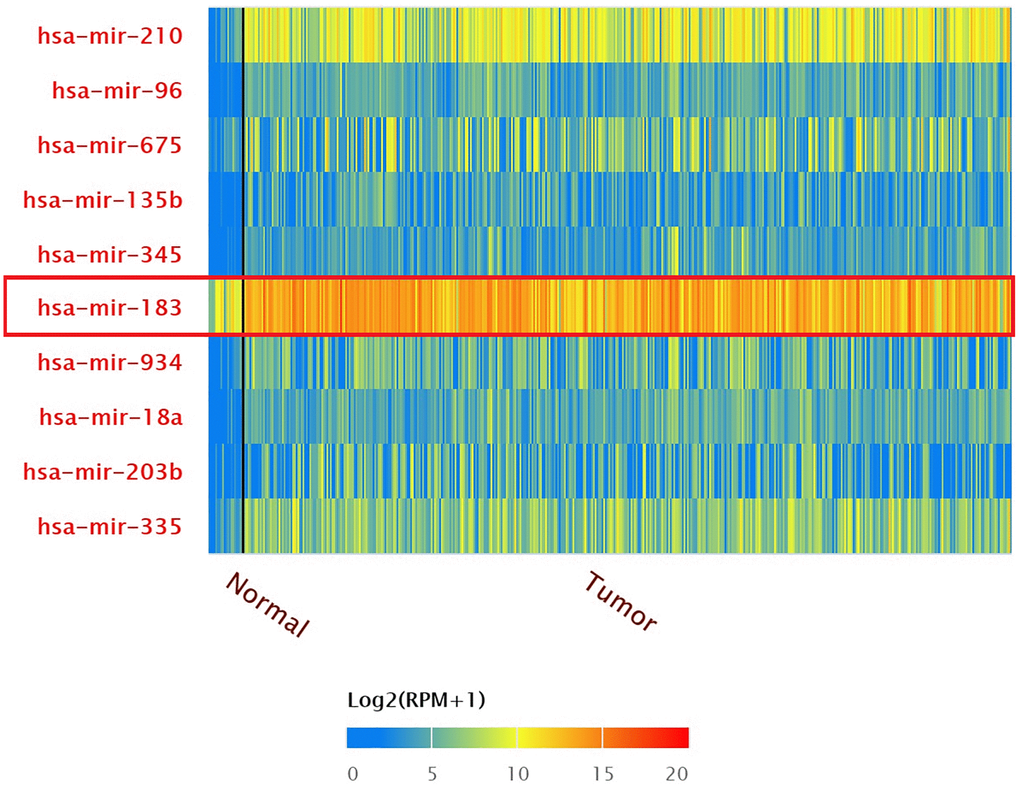 MicroRNA (miRNA), a small noncoding RNA with the function of negative regulating gene expression, plays an important role in the occurrence and development of various tumors [6–8]. The functions of miRNA are not to directly block the expression of genes, but to make a slightly and specifically adjustment to the expression of target genes in post-transcriptional control [9, 10]. MiRNA plays an important regulatory role in the biological processes of normal human cells, including cell division cycle, cell growth, cell apoptosis, cell differentiation and cell response. Almost all tumors have different types of miRNA expression, which are either up-regulated or down-regulated, thus providing new opportunities for miRNA and their predicted target genes to be used as the potential diagnostic or prognostic biomarkers. Hsa-mir-183 has been shown to frequently involve methylation events in human hepatocellular carcinoma and was an unfavorable factor for survival [11]. Huang et al., found that hsa-mir-183 was an overexpressed miRNA in non-small-cell lung cancer and was positively correlated with tumor invasiveness [12]. Additionally, hsa-mir-183 has been reported to be markedly correlated with overall survival for colon adenocarcinoma patients [13]. However, the role of hsa-mir-183 and its predicted target genes in BLCA remains unclear.