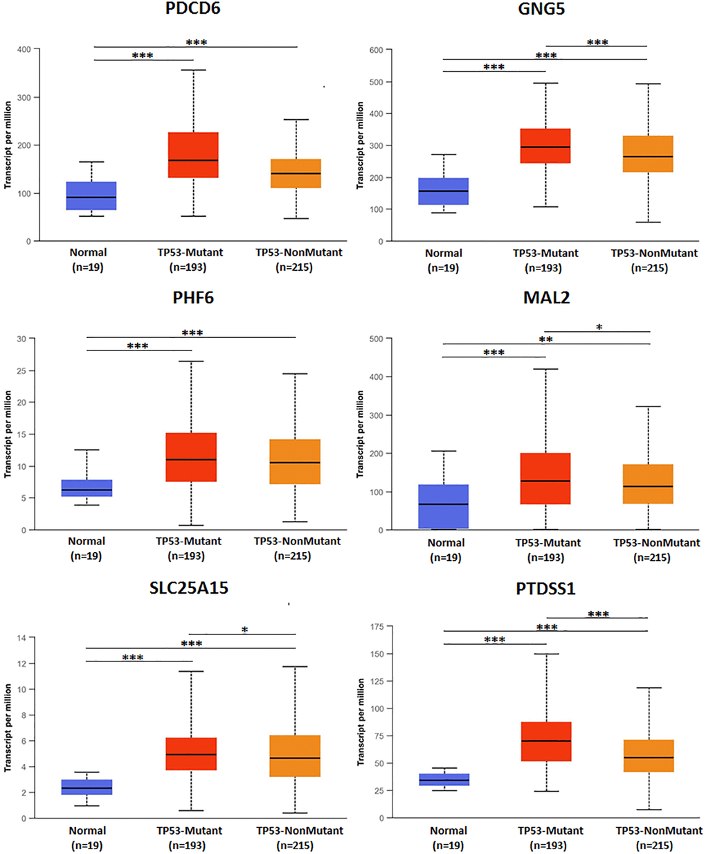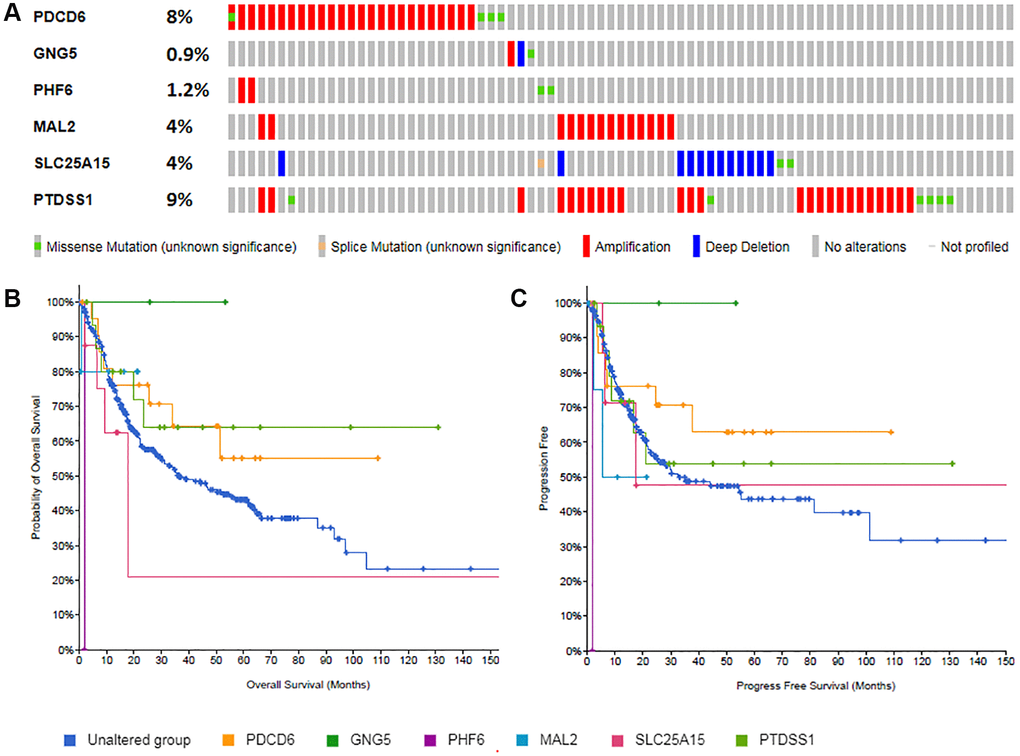 Gene mutations of predicted target genes (PDCD6, GNG5, PHF6, MAL2, SLC25A15, PTDSS1) in BLCA