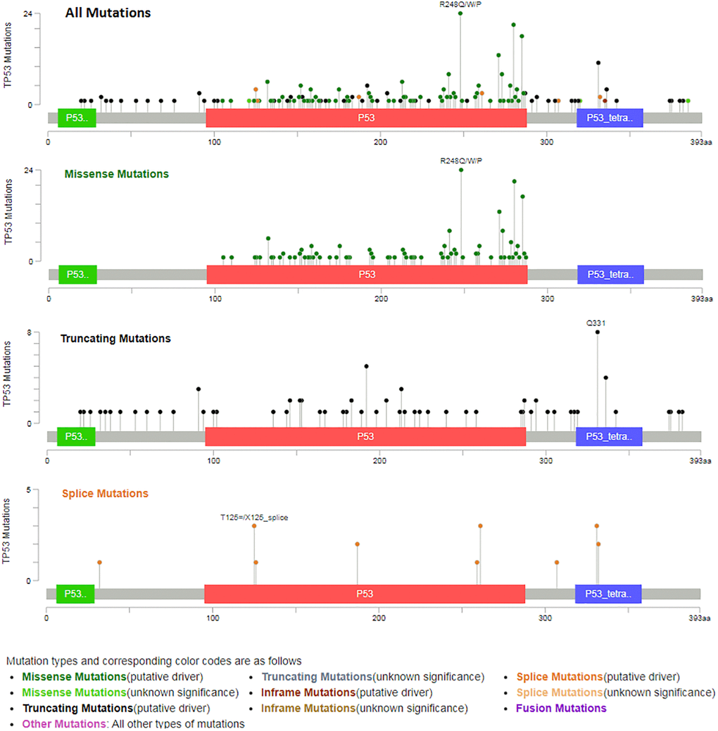 TP53 mutation of predicted target genes (PDCD6, GNG5, PHF6, MAL2, SLC25A15, PTDSS1) were analyzed by UALCAN. The expression of TP53 mutation of GNG5, MAL2, SLC25A15, PTDSS1 in patients with BLCA were significantly increased compared to non-mutation group, and all predicted target genes were markedly increased compared to normal group (Figure 11). In addition, types of TP53 mutation were analyzed by cBioPortal (Figure 12) from Bladder Cancer (MSK/TCGA, 2020). Mutation frequency of TP53 was 51.7% from NM_000546 | ENST00000269305 CCDS11118 | P53_HUMAN.