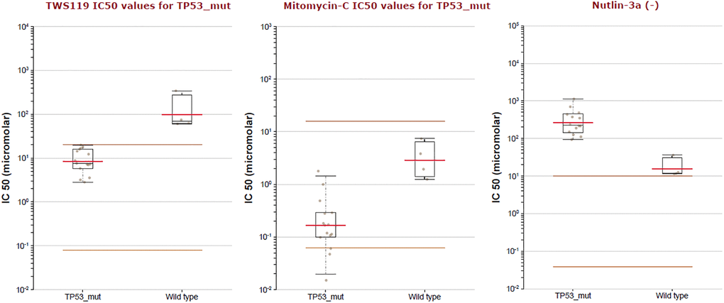 As was showed in Figure 12, TP53 driver had the highest probability of mutation, including Missense (197), Truncating (80) and Splice (17). Furthermore, the drug sensitivity and resistance of TP53 mutation in BLCA were analyzed by Genomics of Drug Sensitivity in Cancer (Figure 13). Nutlin-3a (−) drug target was MDM2 and Nutlin-3a (−) drug target pathway was p53 pathway in BLCA. As was showed in Figure 13 and Table 2, Nutlin-3a (−) had a significant increased resistance in TP53 mutation (P = 2.12e-06) of BLCA patients and the IC50 of Nutlin-3a (−) was significantly increased in TP53 mutation group (P < 0.001). TWS119 drug target was GSK3 and TWS119 drug target pathway was WNT signaling in BLCA. As was showed in Figure 13 and Table 2, TWS119 had a significant increased sensitivity in TP53 mutation (P = 5.95e-06) of BLCA patients and the IC50 of TWS119 was significant decreased in TP53 mutation group (P < 0.001). Mitomycin-C drug target was DNA crosslinker and Mitomycin-C drug target pathway was DNA replication in BLCA. As was showed in Figure 13 and Table 2, Mitomycin-C had a significant increased sensitivity in TP53 mutation (P = 0.000322) of BLCA patients and the IC50 of Mitomycin-C was significant decreased in TP53 mutation group (P = 0.001).