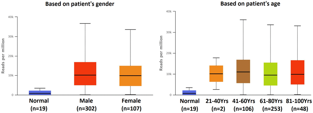 The result of top 10 over-expressed miRNA in BLCA patients were shown by TCGA miRNA analysis (Data from UALCAN) (Figure 1). The expression of hsa-mir-183 in patients with BLCA were significantly increased compared to normal tissue (P = 1.62E-12). The expression of hsa-mir-183 were also significantly increased based on patient’s gender or age (Figure 2). There were significant differences in the Comparison of Normal-vs-Male (P = 1.62E-12), Normal-vs-Female (P = 1.63E-8), Normal-vs-Age (41–60 Yrs) (P < 1E-12), Normal-vs-Age (61–80 Yrs) (P < 1E-12) and Normal-vs-Age (81–100 Yrs) (P = 7.55E-9).