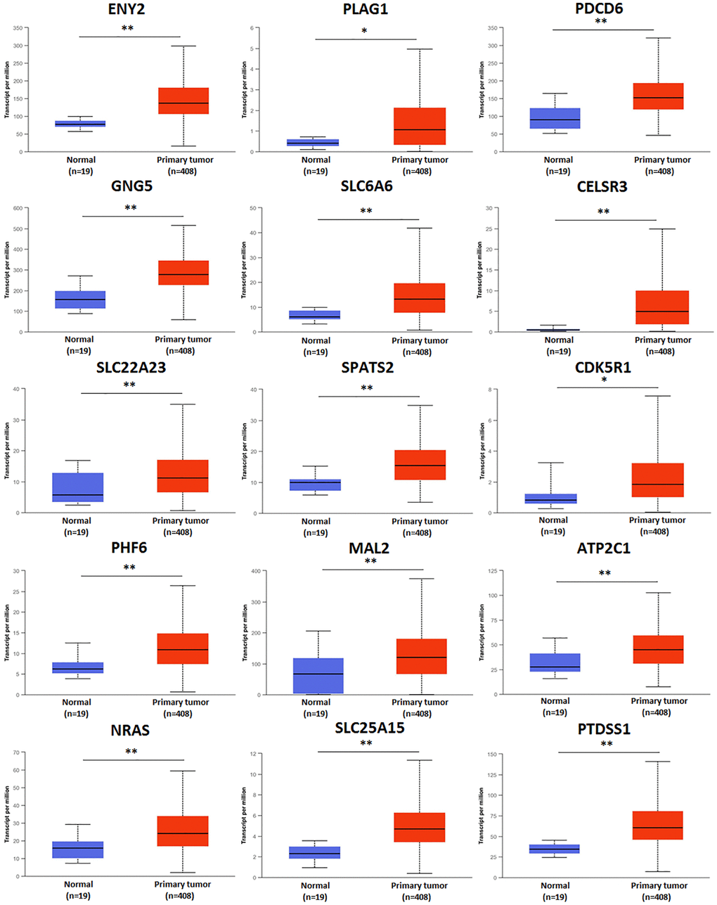 There were 247 predicted genes of hsa-mir-183 (Data from TargetScan, microRNA.org and miRDB), including 15 up-regulated genes, 74 down-regulated genes and 158 unchanged genes in BLCA. 15 up-regulated genes were selected to study in our research (Table 1). The expression of all up-regulated predicted genes of has-mir-183 in patients with BLCA were significantly increased compared to normal tissue (Figure 3).