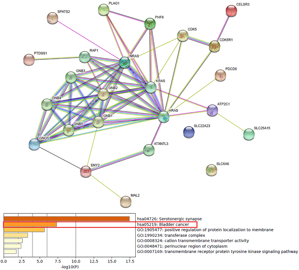 Functions and pathways of up-expressed predicted target genes of hsa-mir-183 and their 10 frequently altered neighbor genes were analyzed by GO and KEGG in Metascape. As the Enrichment heatmap showed that pathways included hsa04726: Serotonergic synapse, hsa05219: Bladder cancer, GO:0007169: transmembrane receptor protein tyrosine kinase signaling pathway, GO:0048471: perinuclear region of cytoplasm, GO:0008324: cation transmembrane transporter activity, GO:1990234: transferase complex and GO:1905477: positive regulation of protein localization to membrane (Figure 4).