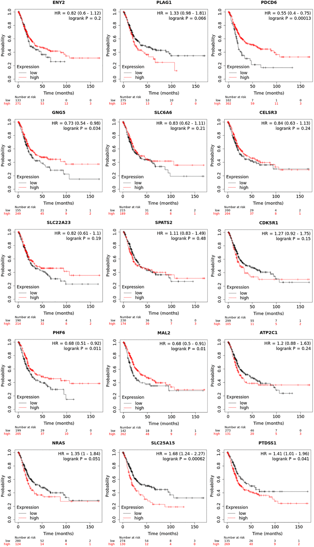 Prognostic value of mRNA expression of up-expressed predicted target genes of hsa-mir-183 were analyzed by Kaplan-Meier plotter (Figure 5). It was showed that mRNA expressions of PDCD6, GNG5, PHF6, MAL2, SLC25A15 and PTDSS1 were significantly associated with BLCA patients’ prognosis. According to the database analysis form Kaplan-Meier plotter, PDCD6 (HR = 0.55, 95% CI: 0.4–0.75, and P = 0.00013), GNG5 (HR = 0.73, 95% CI: 0.54–0.89, and P = 0.034), PHF6 (HR = 0.68, 95% CI: 0.51–0.92, and P = 0.011) and MAL2 (HR = 0.68, 95% CI: 0.5–0.91, and P = 0.01) seem to be the favorable factor for BLCA patients’ prognosis. SLC25A15 (HR = 1.68, 95% CI: 1.24–2.27, and P = 0.00062) and PTDSS1 (HR = 1.41, 95% CI: 1.01–1.96, and P = 0.041) more likely to be the unfavorable factor for BLCA patients’ prognosis. In addition, ENY2, PLAG1, SLC6A6, CELSR3, SLC22A23, SPATS2, CDK5R1, ATP2C1 and NRAS were not prognostic in BLCA patients.