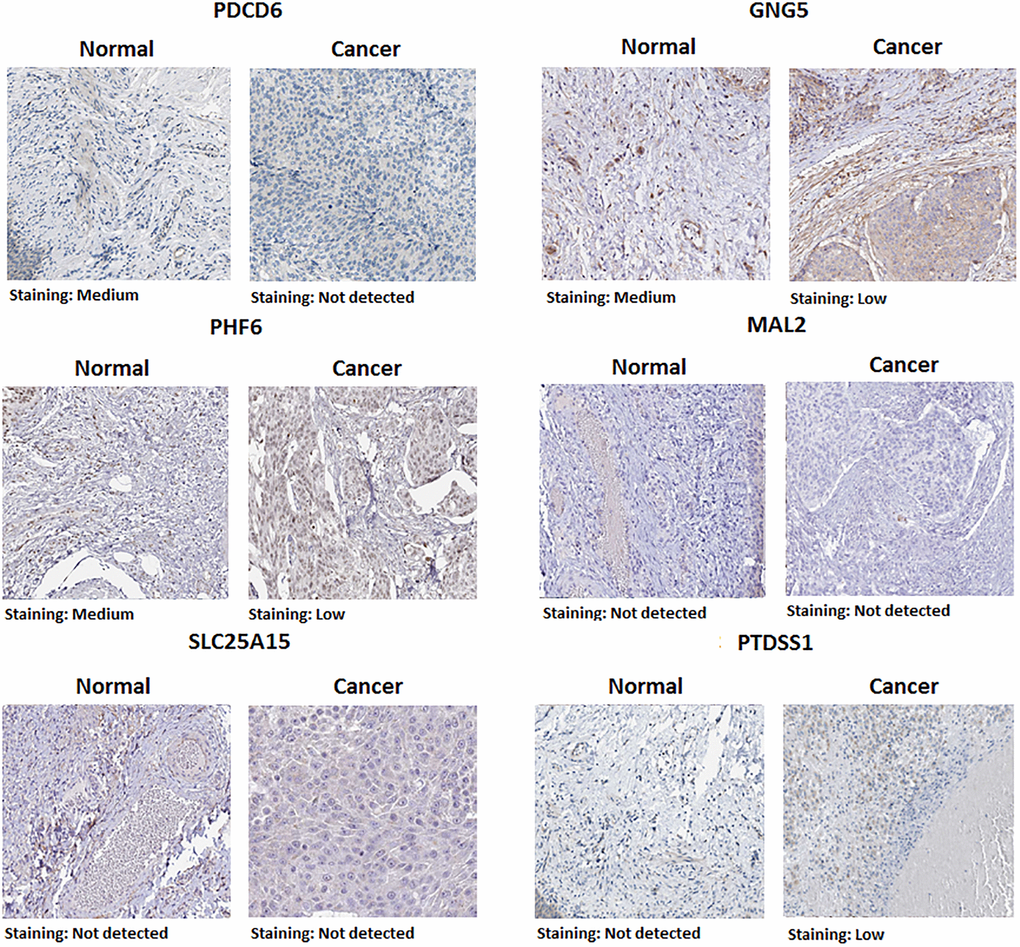 Protein expression and pan cancer analysis of predicted target genes (PDCD6, GNG5, PHF6, MAL2, SLC25A15 and PTDSS1) in BLCA patients
