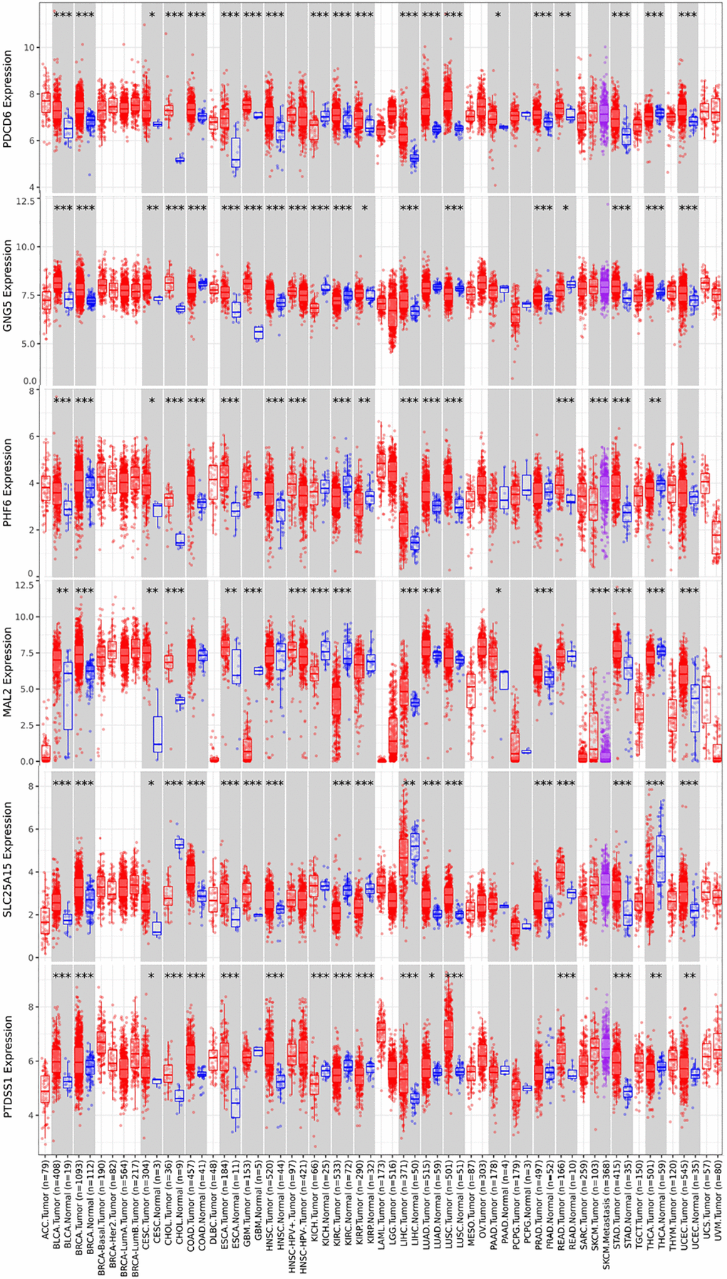 Protein expression of predicted target genes (PDCD6, GNG5, PHF6, MAL2, SLC25A15 and PTDSS1) in BLCA were explored by Human Protein Atlas (Figure 6). The proteins of PDCD6, GNG5 and PHF6 were not or low expressed in BLCA tissues, whereas medium expressions of them were found in normal urinary bladder tissues. It is noteworthy that the protein expression of MAL2 and SLC25A15 could not be detected in both normal urinary bladder tissues and BLCA tissues. Additionally, the protein expression of PTDSS1 in tumor tissues was stronger than that in normal tissues. Furthermore, we performed a pan-cancer analysis of predicted target genes (PDCD6, GNG5, PHF6, MAL2, SLC25A15 and PTDSS1) by using TIMER (Figure 7).