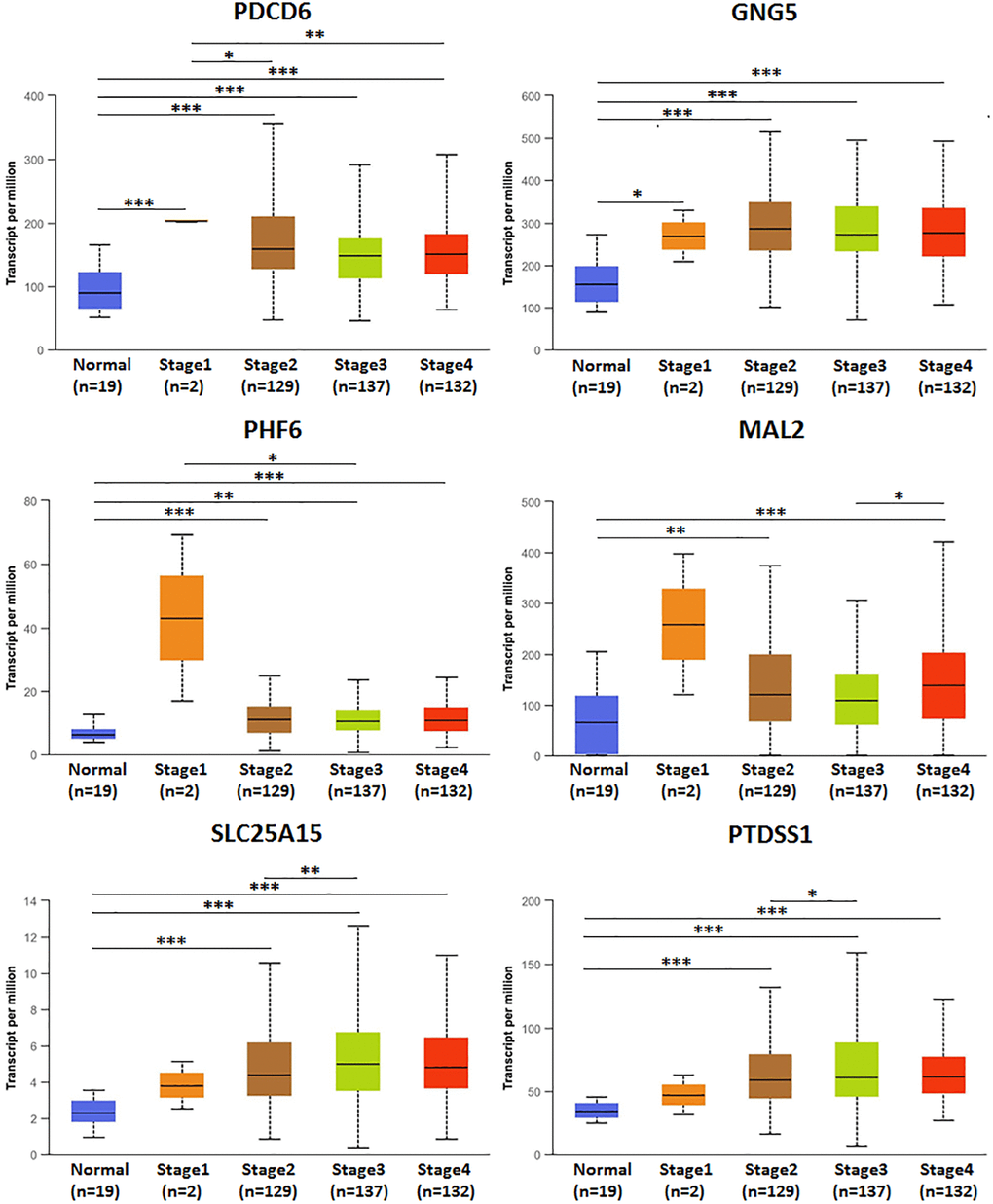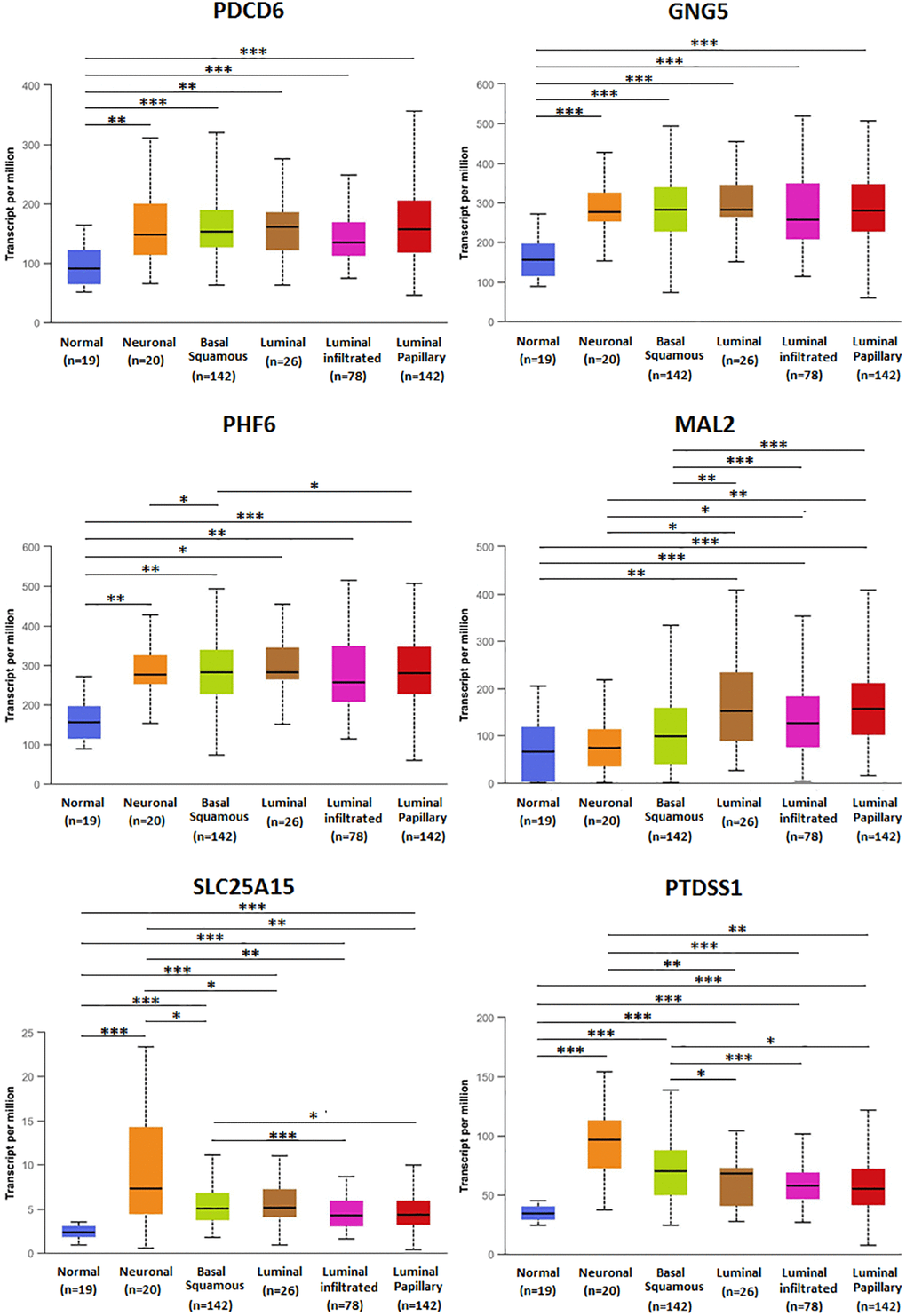 The association of mRNA expression of predicted target genes (PDCD6, GNG5, PHF6, MAL2, SLC25A15, PTDSS1) with clinicopathological parameters of BLCA patients were analyzed by UALCAN, containing BLCA individual cancer stages and molecular subtypes (Figures 8 and 9). Figure 8 showed that the mRNA expression of predicted target genes (PDCD6, GNG5, PHF6, MAL2, SLC25A15, PTDSS1) were significantly correlated with BLCA individual cancer stages. PDCD6, GNG5, PHF6 and MAL2 as favorable factor for BLCA patients, the high mRNA expressions of them tended to be in stage 1 or 2, whereas the high mRNA expressions of unfavorable factor of SLC25A15 and PTDSS1 tended to be in stage 3 or 4. Similarly, Figure 9 showed that the mRNA expression of predicted target genes (PDCD6, GNG5, PHF6, MAL2, SLC25A15, PTDSS1) were significantly correlated with BLCA molecular subtypes. The high mRNA expressions of PDCD6, GNG5, PHF6 and MAL2 tended to be the molecular subtypes of luminal and luminal papillary, whereas the high mRNA expressions of SLC25A15 and PTDSS1 tended to be the molecular subtypes of neuronal and basal squamous.
