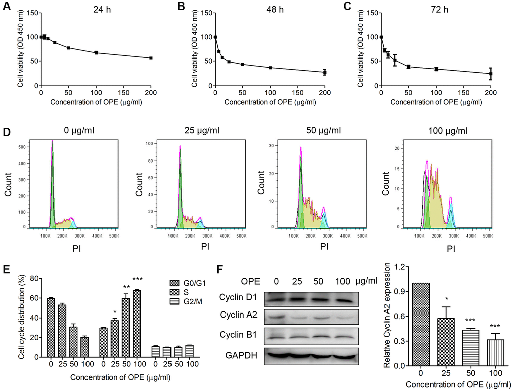 Antibodies against cleaved caspase-3, Bcl-2, Bax, GAPDH, and HRP-conjugated secondary antibodies were purchased from Cell Signaling Technology (USA). Antibodies against Cyclin D1, Cyclin A2, Cyclin B1 were purchased from Proteintech (USA). OPE was obtained as reported previously (Supplementary Figure 2 and Supplementary Table 1) [13]. OPE was dissolved in methanol to make the 100 mg/mL solution and stored at −20°C until use.