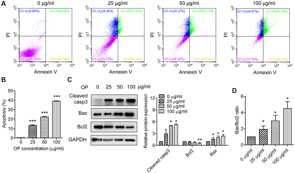 Apoptosis is a key process in regulating cell death. Therefore, we wondered whether OPE had an effect on A20 cell apoptosis. A20 cells were treated with different concentrations of OPE, and the apoptotic rate was ascertained by flow cytometry. Exposure to OPE led to a remarkable increase in apoptotic cell population, which was in a dose-dependent manner (Figure 2A and 2B). The percentages of apoptotic cells in 0 μg/mL, 25 μg/mL, 50 μg/mL, and 100 μg/mL groups were 0.38%, 13.27%, 22.28%, and 38.95%, respectively. In consistent with these results, OPE treatment significantly elevated the expressions of apoptosis proteins, Bax and cleaved-caspase 3, but had no significant effect on Bcl2 expression (Figure 2C). The expression ratio of Bax/Bcl2 was increased after OPE exposure (Figure 2D). Together, these results indicate that OPE suppressed A20 cell growth via triggering apoptosis.