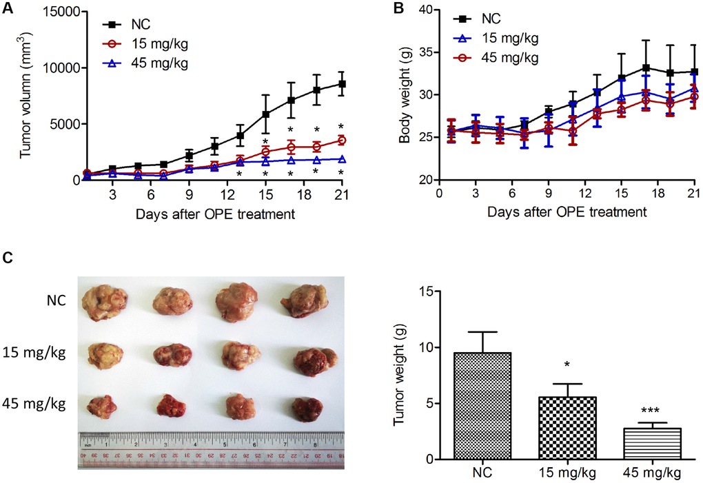 Male Balb/c mice (6–8 weeks, 16–20 g) were housed in-group in cages at a mean constant temperature (25 ± 2°C), humidity (55 ± 5%) and illumination (12 h light-dark cycle), and free access to standard pellet chow and water. The animal experiments were approved by the Institutional Animal Care and Use Committee of Foshan University. 5 × 106 A20 cells in PBS were subcutaneously injected into the right oxter of Balb/c mice. When the tumors reached 50~100 mm3, mice were randomly divided into three groups: the control group, low-dose group and high-dose group (n = 4). Mice in the control group were gavagely administered with PBS. Mice in the low-dose group were gavagely administrated with 15 mg/kg OPE, while mice in the high-dose group was gavagely administrated with 45 mg/kg OPE every other day. The administration was continued for 10 days. At the end of experiment, rats were euthanized with CO2 and tumors were isolated.