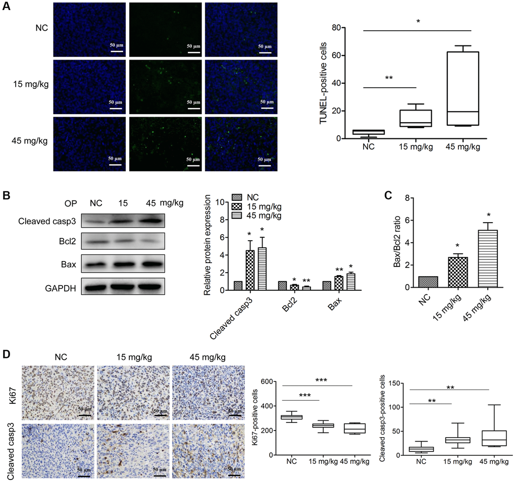 To access the effect of OPE on the apoptosis in A20-derived xenografts, TUNEL staining was performed. Consistent with the in vitro results, increased TUNEL-positive cells were observed in OPE-treated groups (15 mg/kg and 45 mg/kg) compared with the NC group (Figure 4A). Western blot analysis of the tumor tissue samples also showed that the expression levels of cleaved caspase 3 and Bax were dose-dependently increased following the treatment of OPE, while no significance in the expression of Bcl2 was observed (Figure 4B). Consistently, treatment with OPE resulted in an increase in the expression ratio of Bax/Bcl2 in tumor tissues (Figure 4C). In agreement with these results, immuno-histochemistry staining showed that there were more cleaved caspase3-positive cells and fewer Ki67-postive cells in OPE-treated groups than in the NC group (Figure 4D). Together, these results suggest that OPE induces A20 cell apoptosis in vivo.
