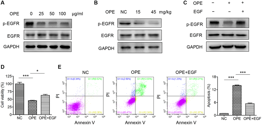 EGFR signaling plays a vital role in the regulation of apoptosis. Therefore, we investigated whether OPE had an effect on the activation of EGFR. Indeed, Western blot analysis showed that administration of OPE remarkable reduced the phosphorylation of EGFR in A20 cells (Figure 5A). Also, the phosphorylation of AKT, a downstream target of EGFR signaling, was reduced after OPE treatment (Supplementary Figure 1). Consistently, the level of p-EGFR in tumors isolated from OPE-treated mice (15 mg/kg and 45 mg/kg) was significantly decreased (Figure 5B). Treatment with EGF could partially restore the cell viability of A20 cells (Figure 5C and 5D). Moreover, administration of EGF restrained the enhanced effect of OPE on the apoptosis rate of A20 cells (Figure 5E). Together, these results implied that EGFR suppression partially accounted for the anti-proliferative activity of OPE in A20 cells.