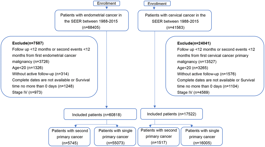 The SEER database covers approximately 97% of all cancer incidences in registry areas within the United States. The database records basic demographics and some clinical characteristics [15]. SEER*stat software (version 8.3.8) was used to select patients. Eligible participants diagnosed with index primary cervical or endometrial cancer between January 1988 and December 2015 were identified (Figure 1). Patients over 20 years old with at least 12 months of follow-up were included. SPMs were defined as a new primary cancer occurring at least 12 months after an index cancer [16]. A one-year latency after the diagnosis of initial cancer was required to exclude recurrence or metastases of the first neoplasm [16]. Stage IV patients were also excluded to avoid metastases of primary cancer. Additionally, patients diagnosed via only autopsy or death certificate were excluded, as follow-up information was not available. All patients had complete data such as year of diagnosis, age, race, marital status, disease stage, RT (yes or no/unknown), chemotherapy (yes or no/unknown), and surgery (yes or no/unknown). The study ended at the diagnosis date of SPMs, the death of patients, or the end date of the study (December 31, 2015), whichever came first.