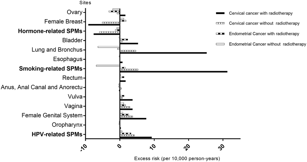 Figure 2 demonstrates the excess risk of SPMs in cervical and endometrial cancer survivors. Overall, the trend of excess risk was consistent with the corresponding SIRs. The largest difference in SPM excess risk between cervical and endometrial cancer survivors was observed in potentially smoking-related SPMs (31.3 vs. 1.6 per 10,000 person-years). However, the trend was opposite for some sites such as the breast (excess risk: –9.2 vs. 1.8 per 10,000 person-years). Cervical cancer survivors with RT had a substantially higher potential HPV-related SPM excess risk than endometrial cancer survivors (9.3 vs. 3.3 per 10,000 person-years). Although the excess risk of potentially hormone-related SPMs in endometrial cancer survivors was higher than that of cervical cancer survivors (–1.4 vs. –7.6 per 10,000 person-years), it was lower than the general population risk.