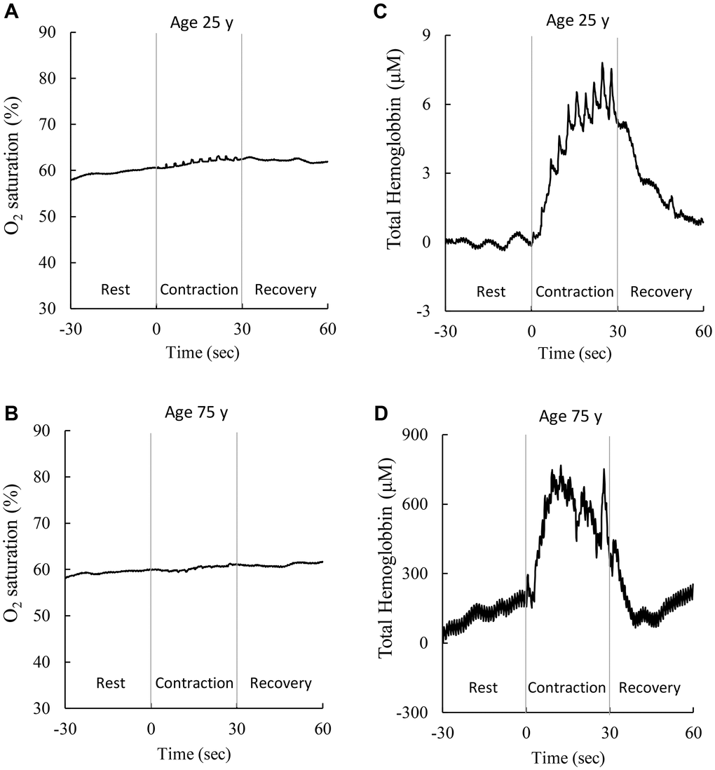 Sex stratification and anthropometrical characteristics of the participants are shown in Table 1. Resting BOV values were consistently low and similar for participants across the entire age range (age 20–88 y). While no difference in median BOV was found before and after age 50 y, median BHV was substantially greater in participants aged >50 y than those younger age counterparts for each quartile. Figure 1 shows examples of cerebral hemodynamic response during maximal handgrip muscle contractions (10 repetitions in 30 sec) of men aged 25 y and 75 y, respectively. The amplitude of fluctuations in cerebral oxygenation (oxyhemoglobin-to-total hemoglobin ratio, BOV) against the 30-sec muscle contraction was small (A, B), whereas cerebral hemoglobin fluctuation was increased substantially above the rest phase (C, D) for both age levels. While the response patterns against muscle exertion are similar for both ages, the scale of such changes in cerebral hemoglobin during a maximal handgrip muscle strength test was substantially greater (~100 folds) for the adult aged 75 y (D) than 25 y (C), indicating a greater vascular struggle in the older adult to maintain a stable oxygenation in the brain.